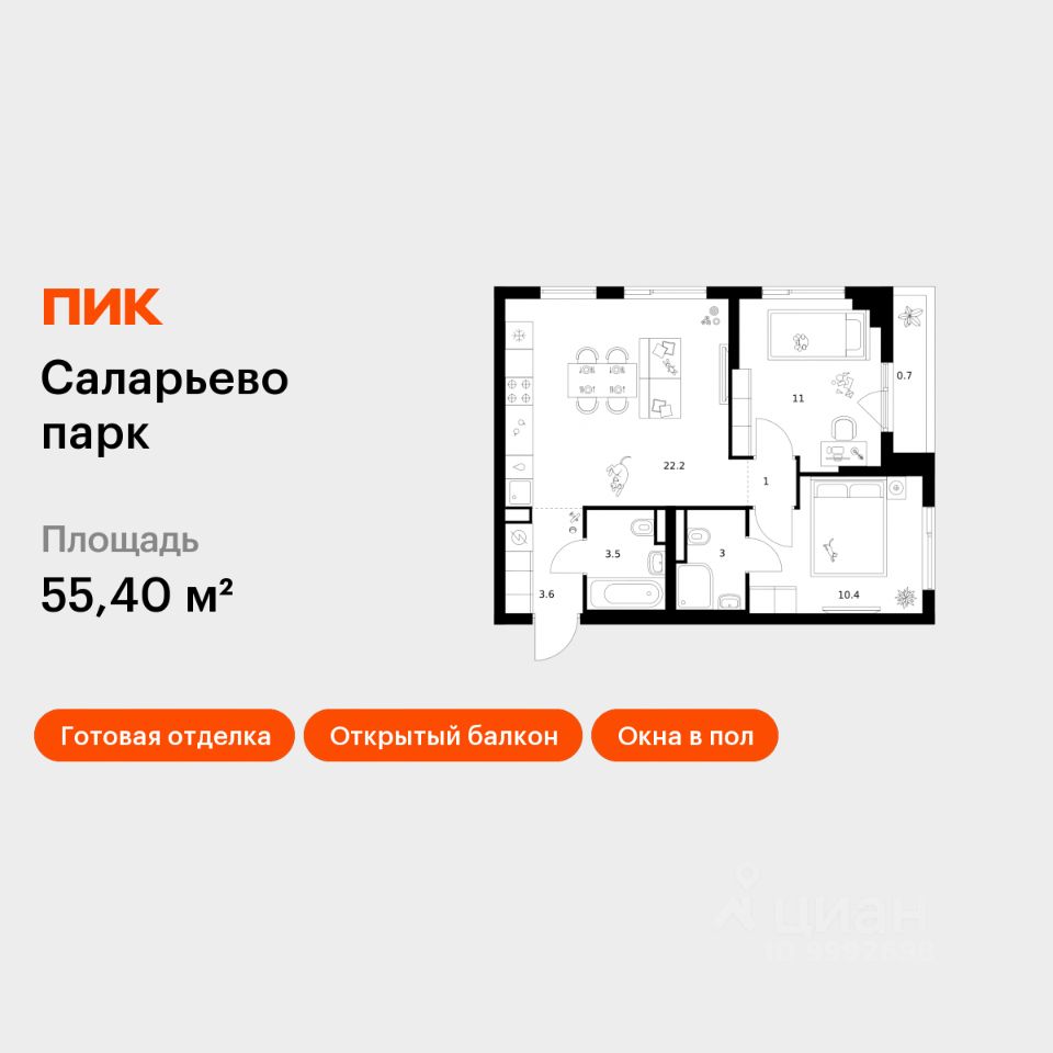Продаётся 2-комн. квартира площадью 55,4 кв.м на 18 этаже 18 этажного дома (Корпус 74.9, Секция 9) проекта ПИК Саларьево парк. Светлый просторный подъезд на уровне земли, функциональная планировка, большие окна, c отделкой.