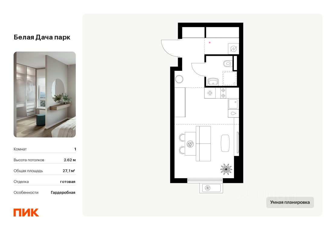 Продаётся квартира-студия площадью 27,1 кв.м на 11 этаже 15 этажного дома (Корпус 16.2, Секция 6) проекта ПИК Белая Дача парк. Светлый просторный подъезд на уровне земли, функциональная планировка, большие окна, .