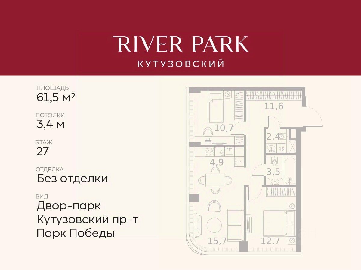 Расположение и Транспортная доступность: - На берегу Москвы-реки, напротив Москва-Сити - 600 метров до Кутузовского проспекта - Удобный съезд с ТТК - Прямой выезд на МКАД по Северному дублеру Кутузовского проспекта. - В пешей доступности 3 станции метро: Фили, Парк Победы, Кутузовская, а также станция МЦД Фили. Архитектура от именитого бюро ADM отличается уникальной пластикой фасадов - башни словно парят в воздухе, играя гранями как драгоценные камни. Жилой комплекс состоит из 5-ти небоскребов с home park на закрытой территории и внешней торговой галереей с открытым доступом.