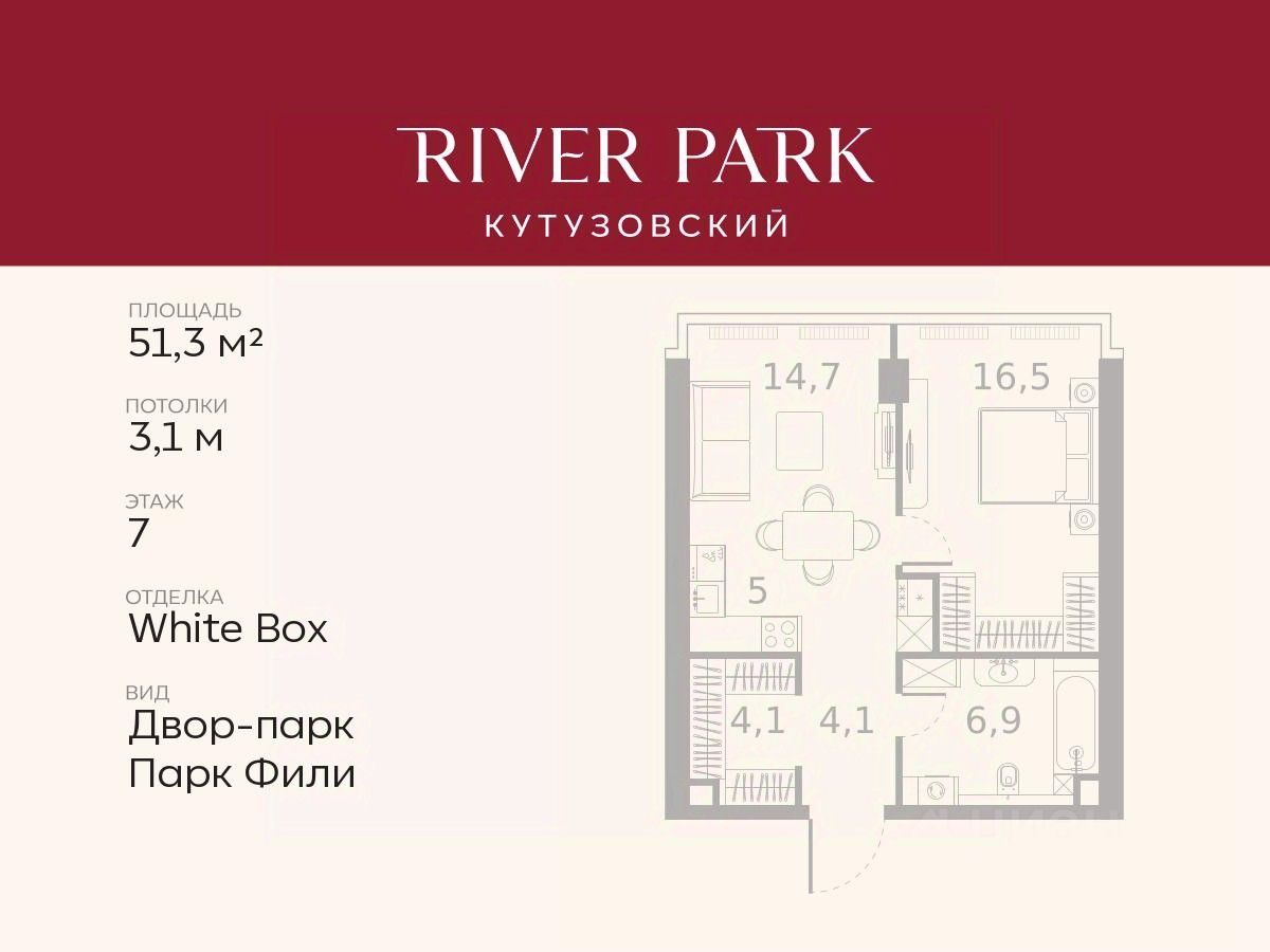 Расположение и Транспортная доступность: - На берегу Москвы-реки, напротив Москва-Сити - 600 метров до Кутузовского проспекта - Удобный съезд с ТТК - Прямой выезд на МКАД по Северному дублеру Кутузовского проспекта. - В пешей доступности 3 станции метро: Фили, Парк Победы, Кутузовская, а также станция МЦД Фили. Архитектура от именитого бюро ADM отличается уникальной пластикой фасадов - башни словно парят в воздухе, играя гранями как драгоценные камни. Жилой комплекс состоит из 5-ти небоскребов с home park на закрытой территории и внешней торговой галереей с открытым доступом.