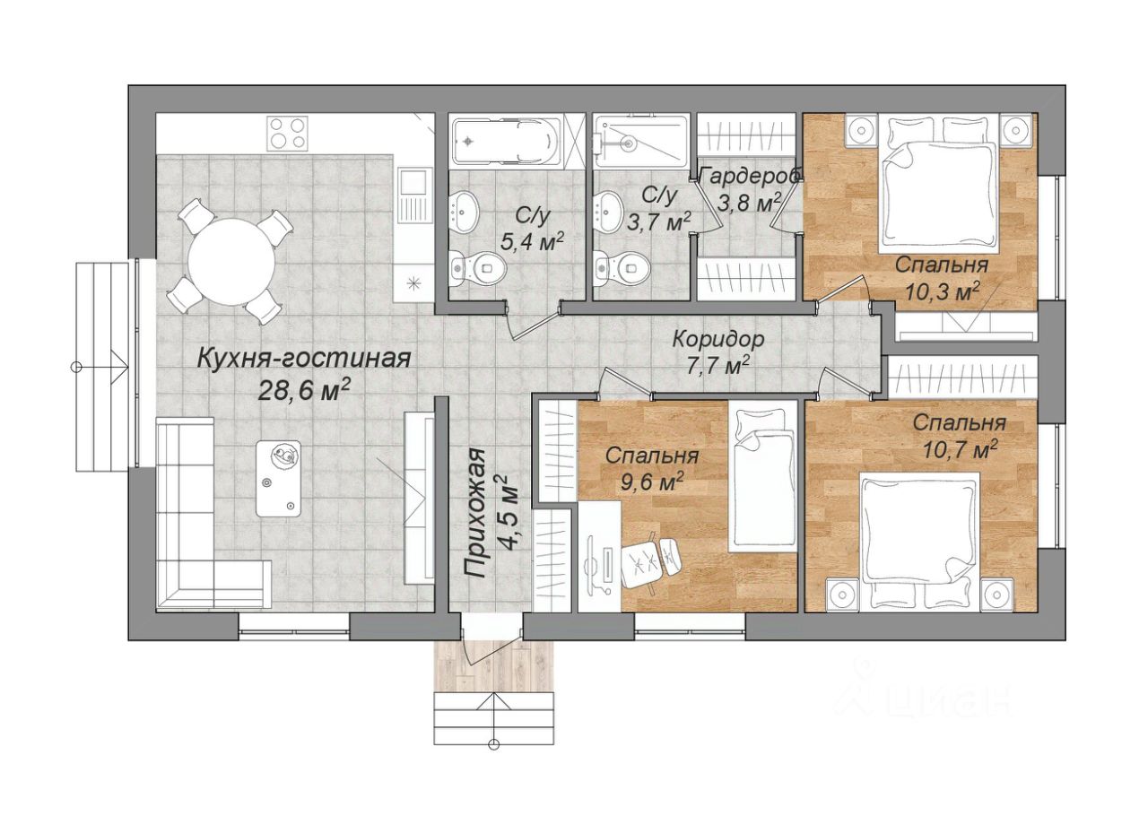 Планировка: уютная кухня-гостиная, большие спальни