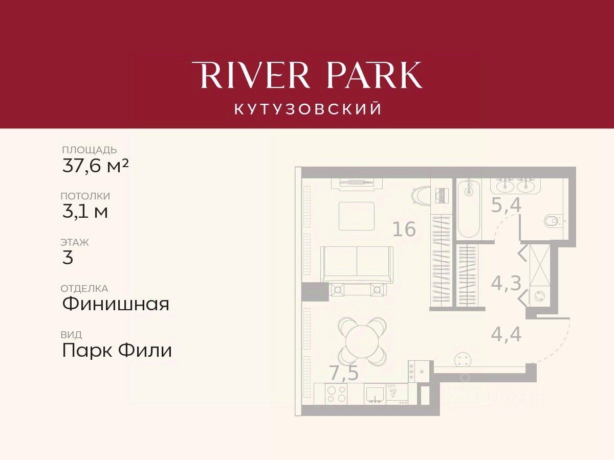 Расположение и Транспортная доступность: - На берегу Москвы-реки, напротив Москва-Сити - 600 метров до Кутузовского проспекта - Удобный съезд с ТТК - Прямой выезд на МКАД по Северному дублеру Кутузовского проспекта. - В пешей доступности 3 станции метро: Фили, Парк Победы, Кутузовская, а также станция МЦД Фили. Архитектура от именитого бюро ADM отличается уникальной пластикой фасадов - башни словно парят в воздухе, играя гранями как драгоценные камни. Жилой комплекс состоит из 5-ти небоскребов с home park на закрытой территории и внешней торговой галереей с открытым доступом.