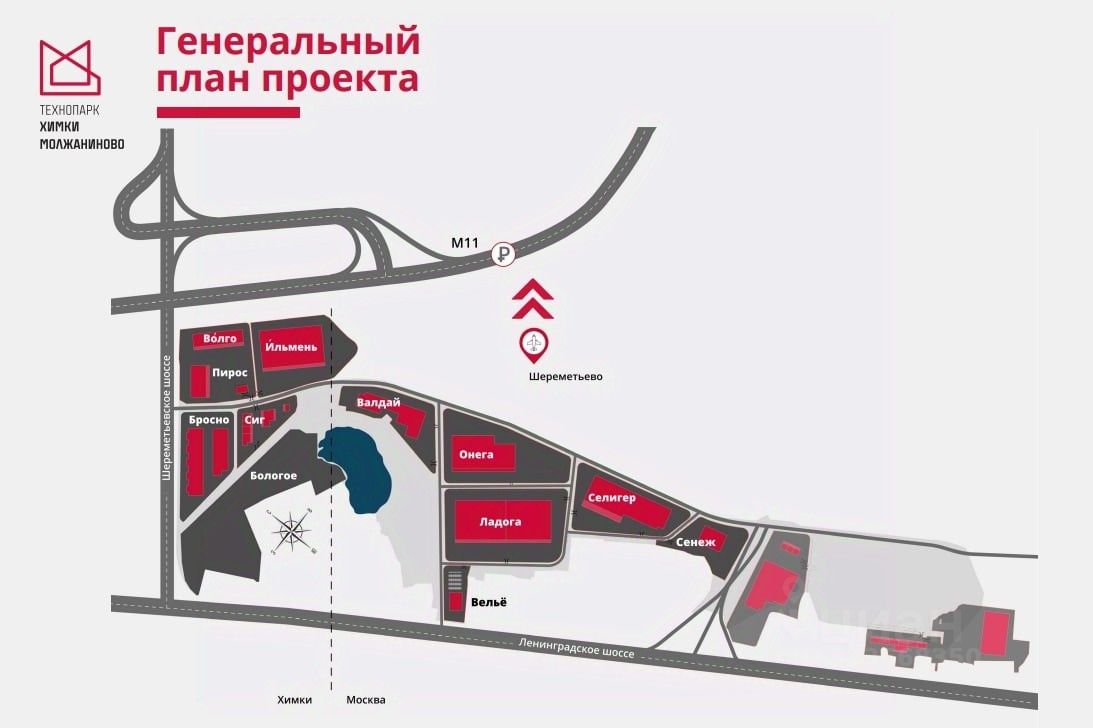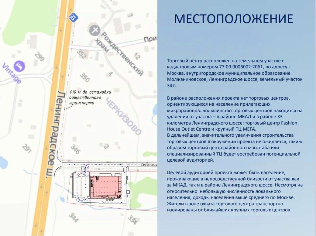 Будет расположен на первой линии Ленинградского шоссе, в районе деревни Черкизово, по направлению в область.