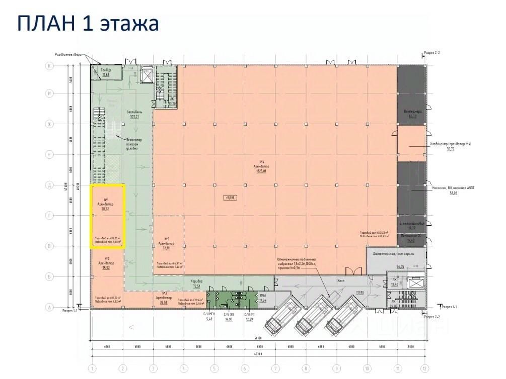 На первом этаже просторный вестибюль с пассажирским лифтом и открытой лестницей, коммерческие помещения, погрузочно-разгрузочная зона, сантехнические помещения.
