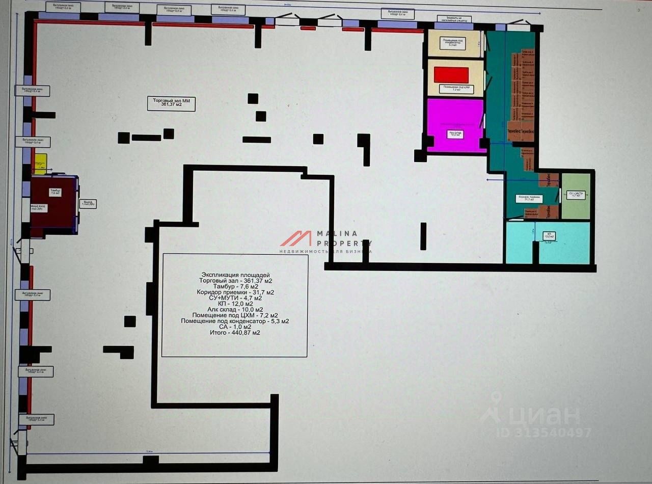 Помещение 444,7 м2, располагается на 1 этаже, открытая планировка, пять отдельных входов, высота потолка 4 м, витринные окна по фасаду. Парковка перед фасадом. Место для размещения рекламы.