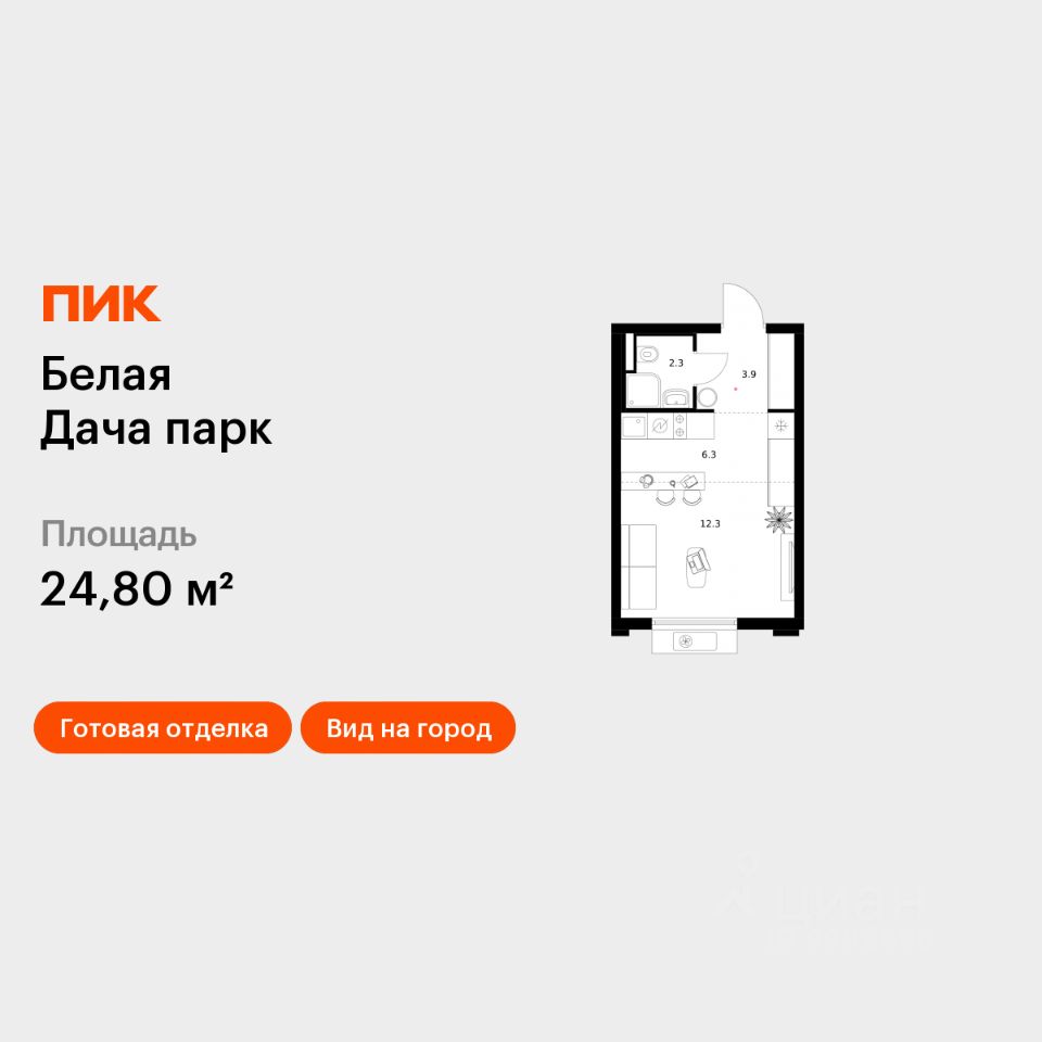 Продаётся квартира-студия площадью 24,8 кв.м на 2 этаже 19 этажного дома (Корпус 16.1, Секция 3) проекта ПИК Белая Дача парк. Светлый просторный подъезд на уровне земли, функциональная планировка, большие окна, c отделкой.