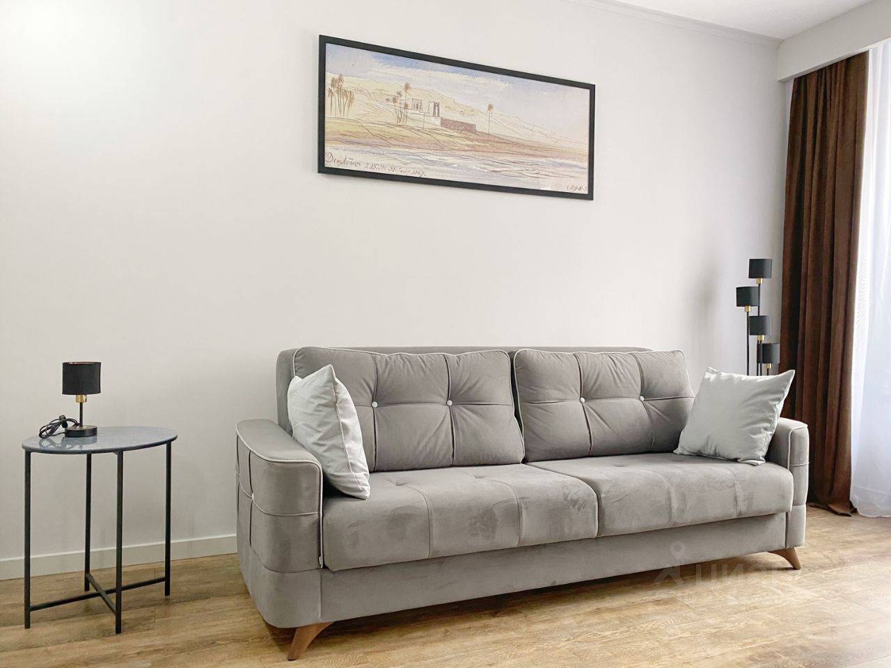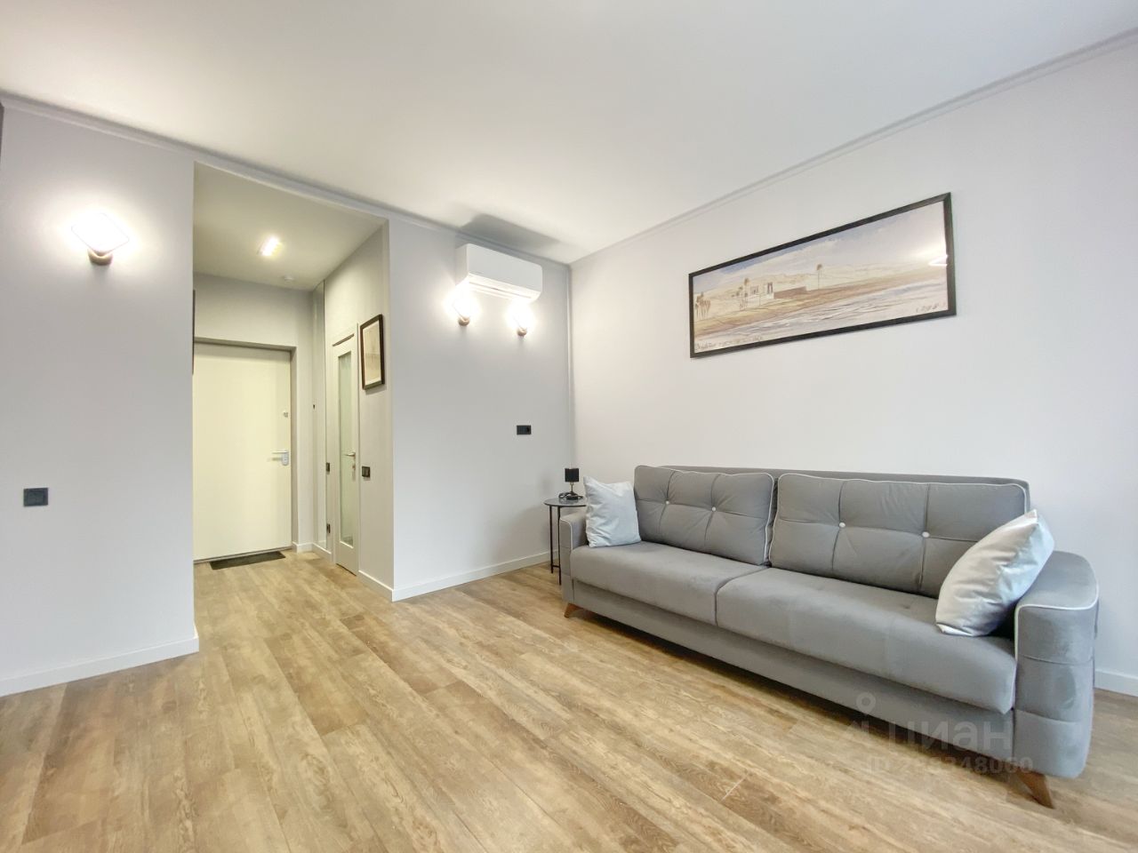 В комнате современный интерьер, комфортный диван-кровать, установлен кондиционер.