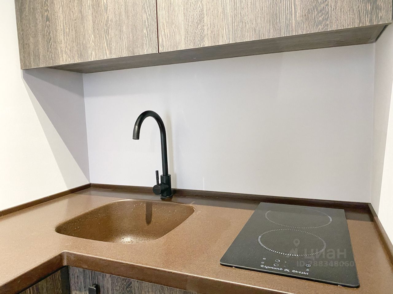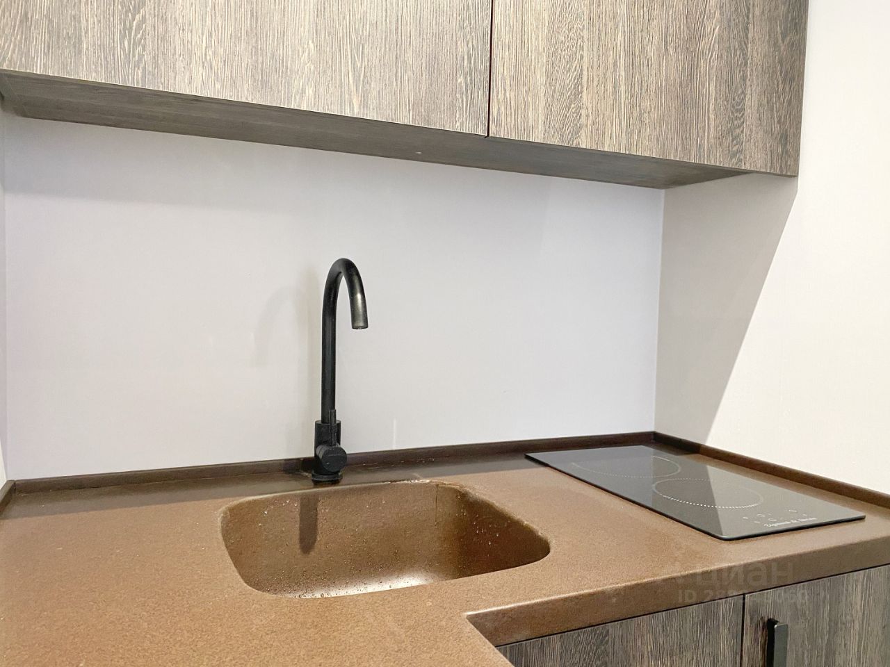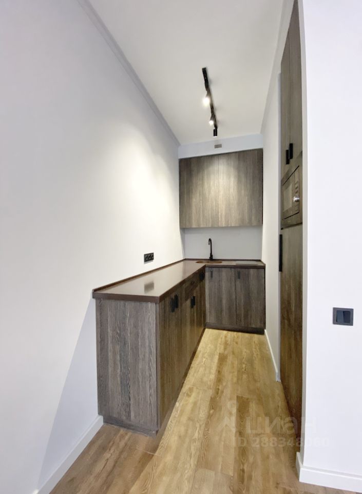 Зона кухни с необходимой встроенной техникой. Есть плита, холодильник, свч.