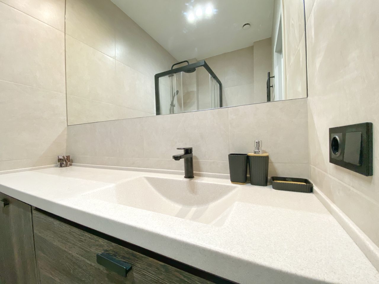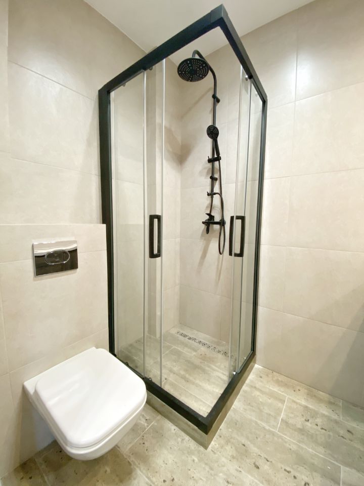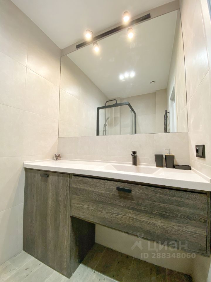 Сан.узел. совмещённый с изготовленной на заказ душевой кабиной и современной мебелью. Установлена стиральная машина.