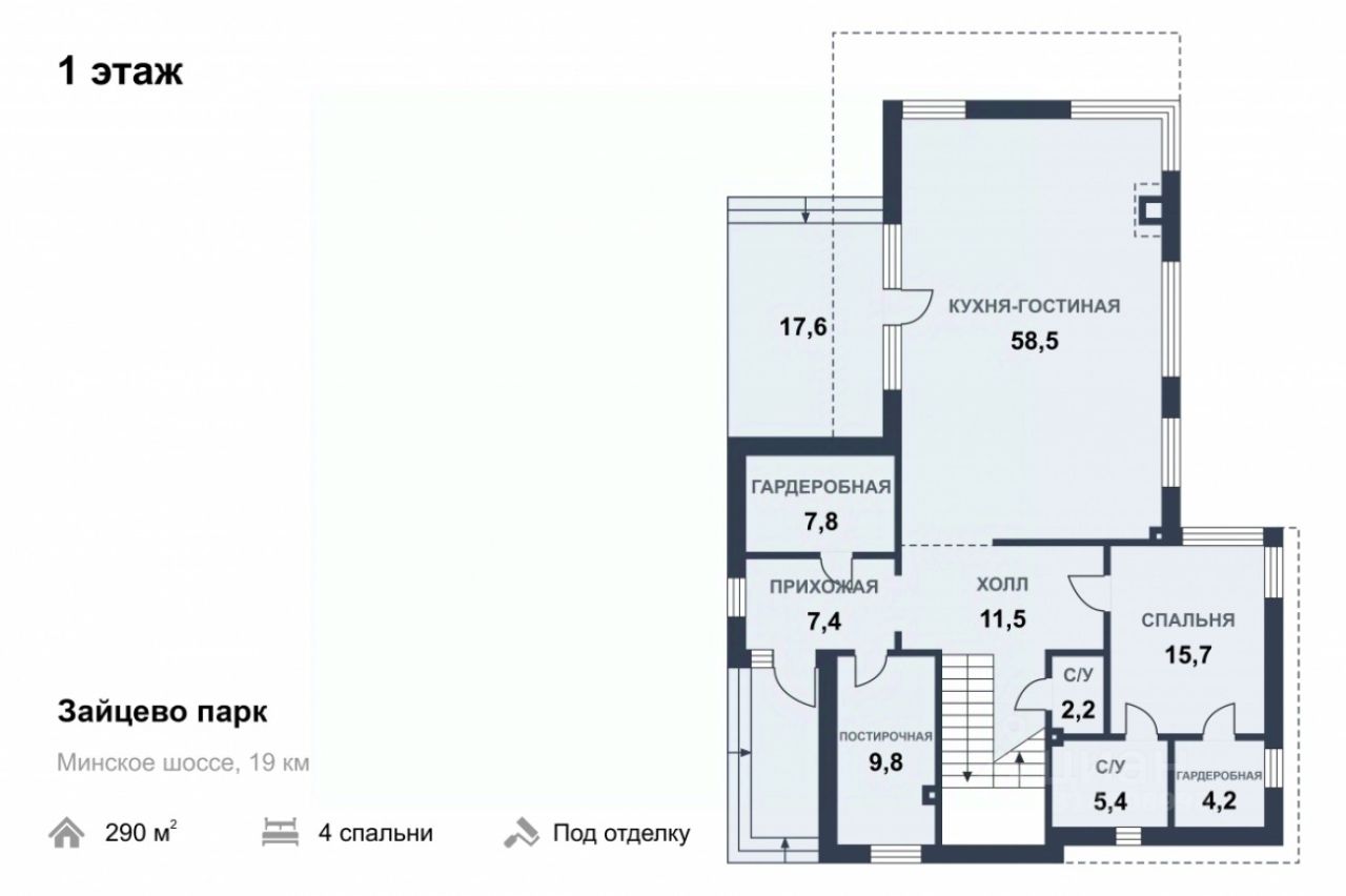 1 этаж: холл, кухня-гостиная, спальня, 2 с/у, 2 гардеробные, постирочная.