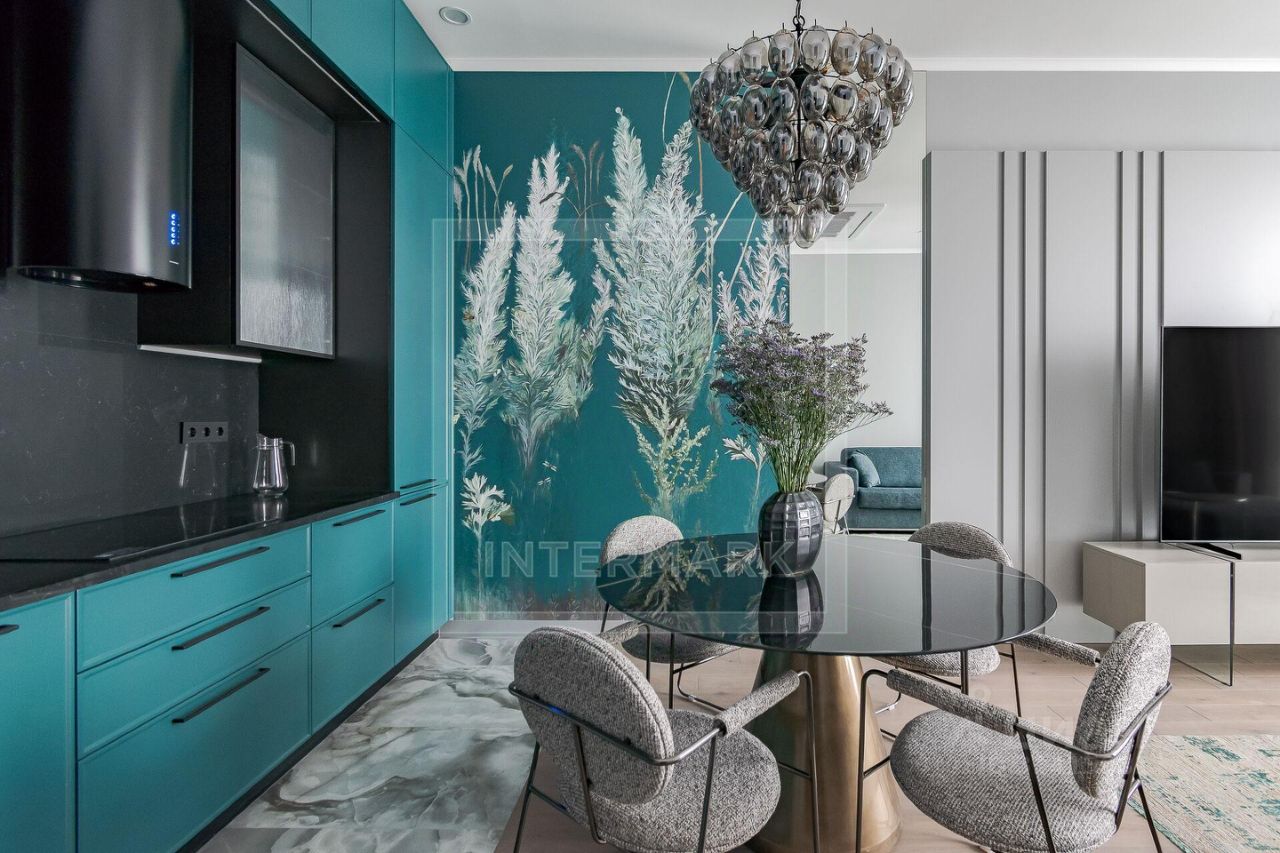 Выполнена изящная, современная отделка в эффектной серо-нефритовой палитре - интерьер апартаментов невероятно гармоничный и стильный! В процессе ремонта использованы высококачественные материалы: на полу - инженерная доска Greenline(Россия), стены - краска Flugger(Дания), керамогранит Atlasconcorde, Cerdomus (Италия, Россия).