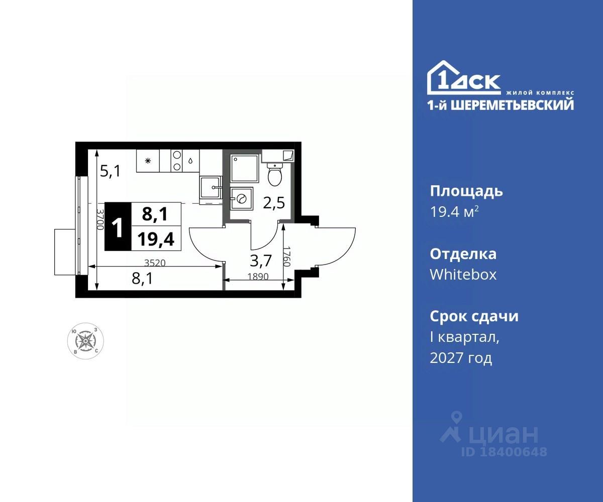 Максимальные скидки при 100% оплате. Прямая продажа от застройщика! Жилой Комплекс класса Комфорт плюс. Продаётся студия номер 110 общей площадью 19.4 кв.м на 11-м этаже 16 этажного дома. Отделка Whitebox.