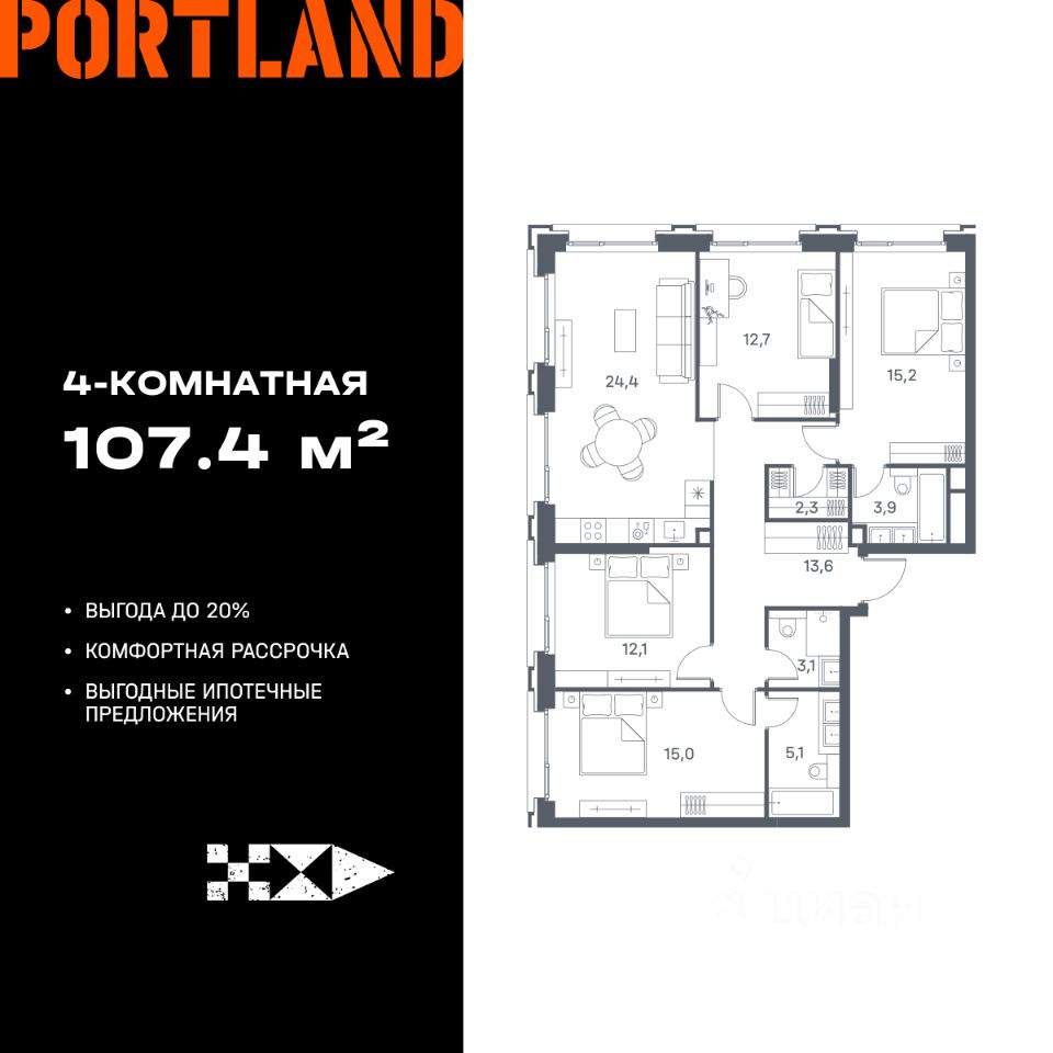Продаётся 4-к. квартира, 13 этаж в жилом комплексе бизнес-класса Portland от девелопера FORMA. ЖК расположен на берегу Москвы-реки в северной части района Печатники в акватории Южного речного порта. Основные преимущества проекта: • Самая протяженная береговая линия реки в Москве 13 км. • Вид на реку в сторону запада панорамные окна на самое широкое водное пространство Москва-реки (900 м) и на закат. • 95% квартир с видом на воду. • К Portland не примыкает крупных автомагистралей - отсутствие фонового шума дорог. • В перспективе ближайших 11 лет на территории района запланировано грандиозное преобразование и комплексное развитие. • Собственная набережная длиной 412 м., которая после завершения строительства сомкнется с эко-парком Печатники. • Прямой выход к воде и отсутствие проезжей части между Portland и береговой линией. • Инфраструктурное разнообразие: супермаркеты, крупные торговые центры, рестораны, кафе, фитнес-клубы, бьюти-салоны, компании сферы услуг и многое другое. • Собственная школа на 300 мест и детский сад на 275 мест. • Паркинг на 650 м/м • Транспортная вседоступность: метро, авто, велосипед, речной трамвай, канатная дорога • 15 мин. пешком до м. Печатники, 15 мин. на авто до ТТК, 20 минут на авто до Садового кольца