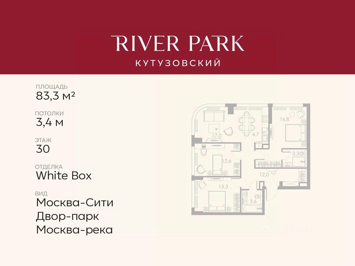 Продается 3-к квартира площадью 83.3 кв.м. на 30-м этаже в жилом комплексе премиум-класса River Park Кутузовский в Башне Diamond Tower