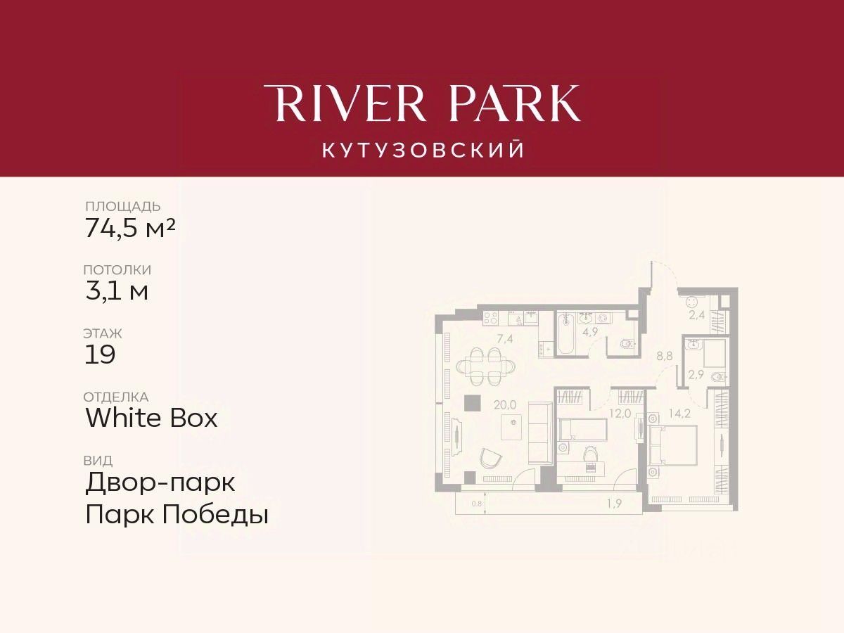 Продается 2-к квартира площадью 74.5 кв.м. на 19-м этаже в жилом комплексе премиум-класса River Park Кутузовский в Башне Diamond Tower