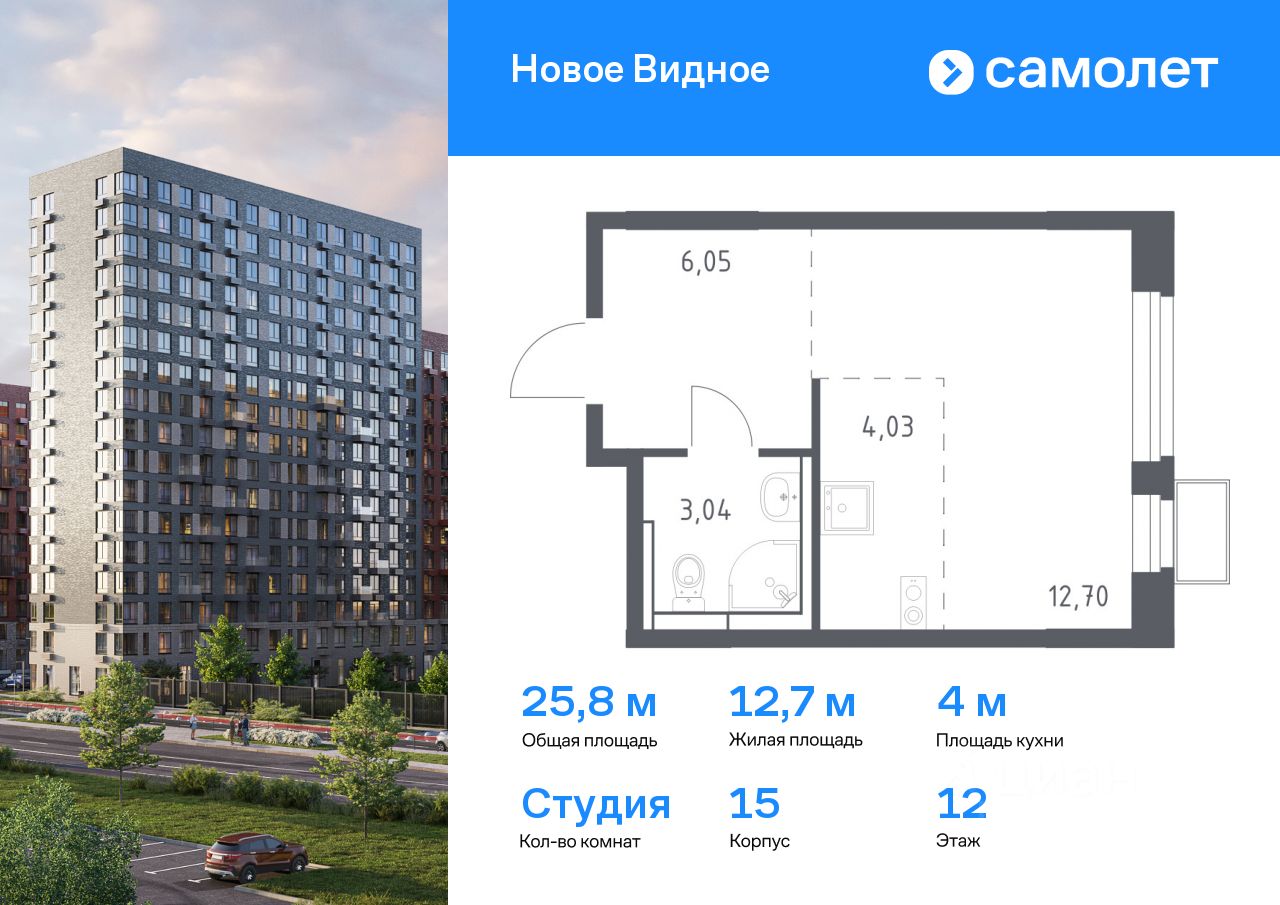 Предлагается квартира студия комфорт-класса 25,82 кв.м в корпусе 15 на 12 этаже, в ЖК ''Новое Видное'' Квартира с чистовой отделкой. Доступность дополнительных опций уточняйте у застройщика.