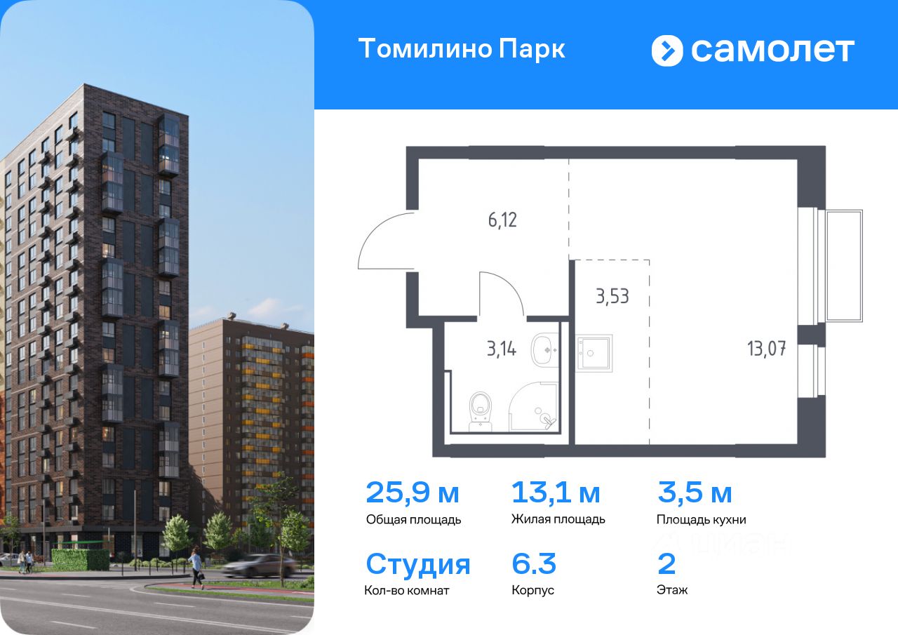 Предлагается квартира студия комфорт-класса 25,86 кв.м в корпусе 6.3 на 2 этаже, в ЖК ''Томилино Парк'' Квартира с чистовой отделкой. Доступность дополнительных опций уточняйте у застройщика.