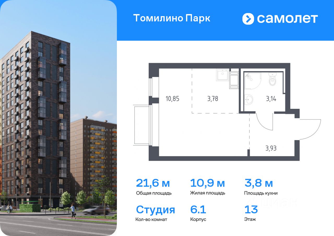 Предлагается квартира студия комфорт-класса 21,6 кв.м в корпусе 6.1 на 13 этаже, в ЖК ''Томилино Парк'' Квартира с предчистовой отделкой. Доступность дополнительных опций уточняйте у застройщика.