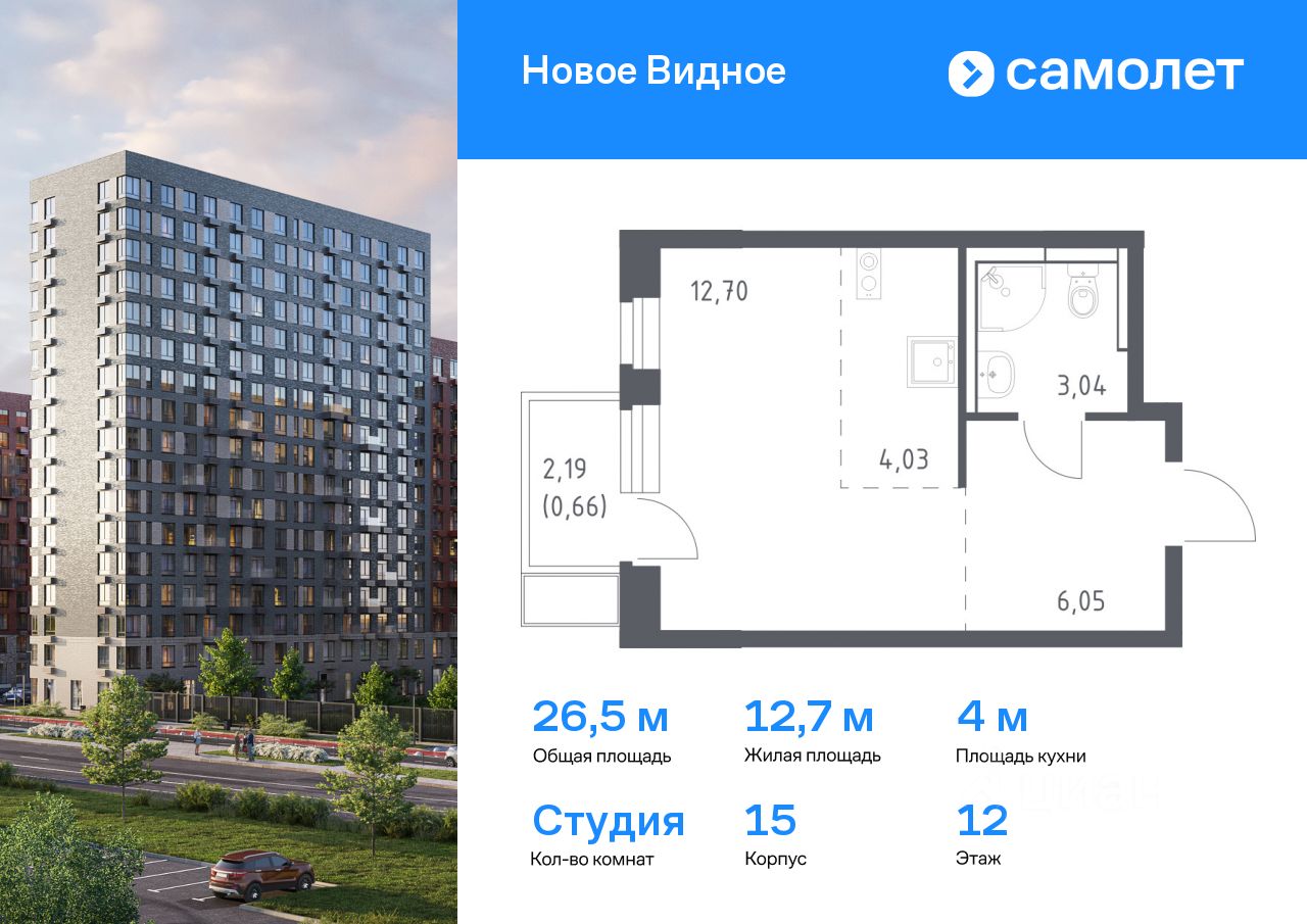 Предлагается квартира студия комфорт-класса 26,48 кв.м в корпусе 15 на 12 этаже, в ЖК ''Новое Видное'' Квартира с чистовой отделкой. Доступность дополнительных опций уточняйте у застройщика.