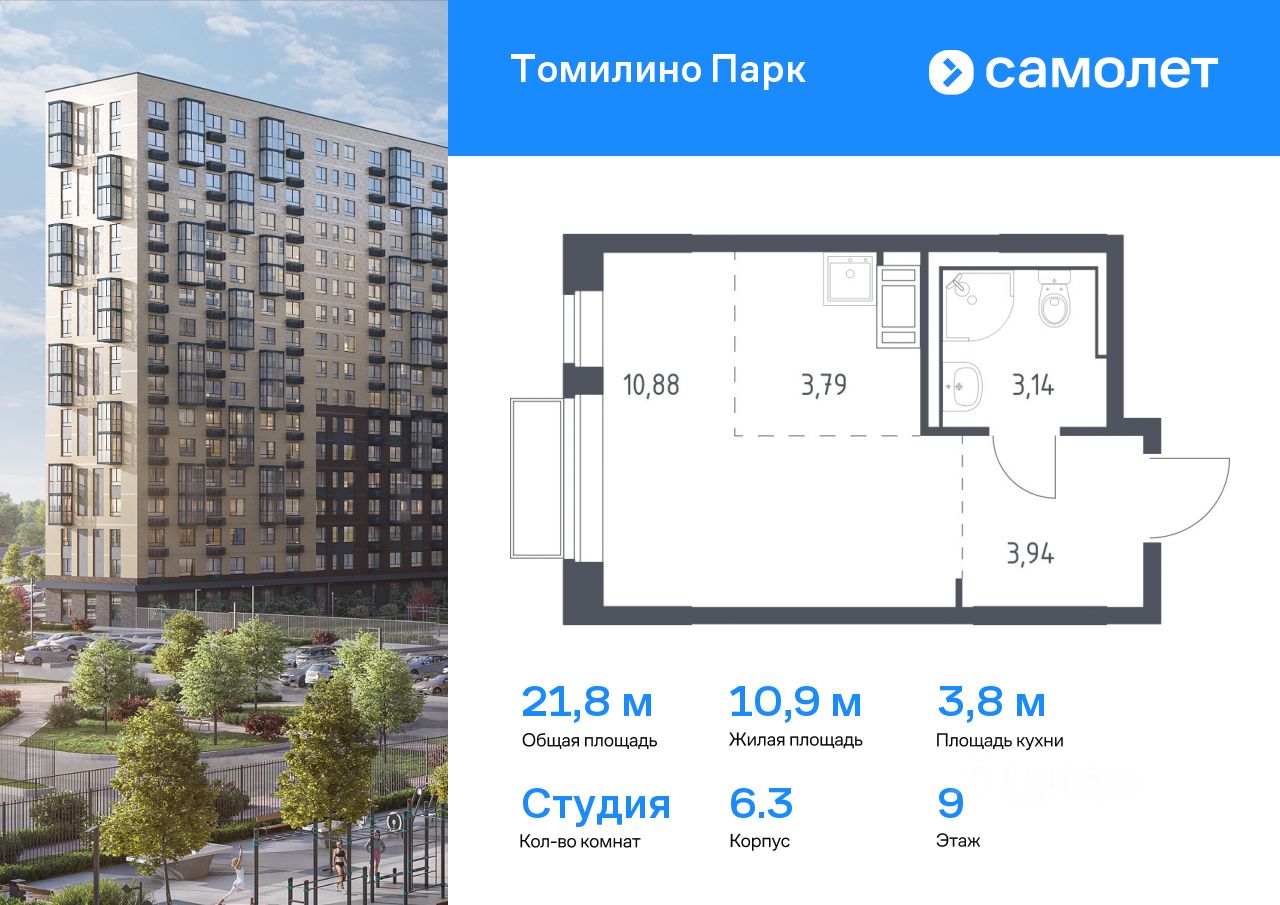 Предлагается квартира студия комфорт-класса 21,75 кв.м в корпусе 6.3 на 9 этаже, в ЖК ''Томилино Парк''