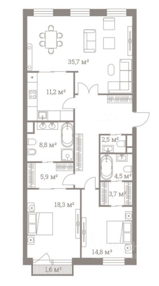 Многофункциональная свободная планировка включает: кухня, гостиная, две спальни с собственными гардеробными и с/у, постирочная, холл, гостевой с/у.
