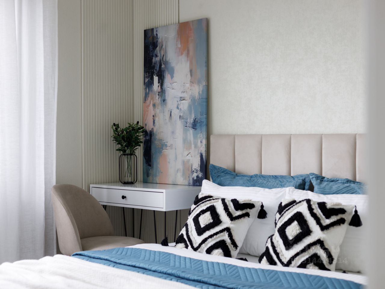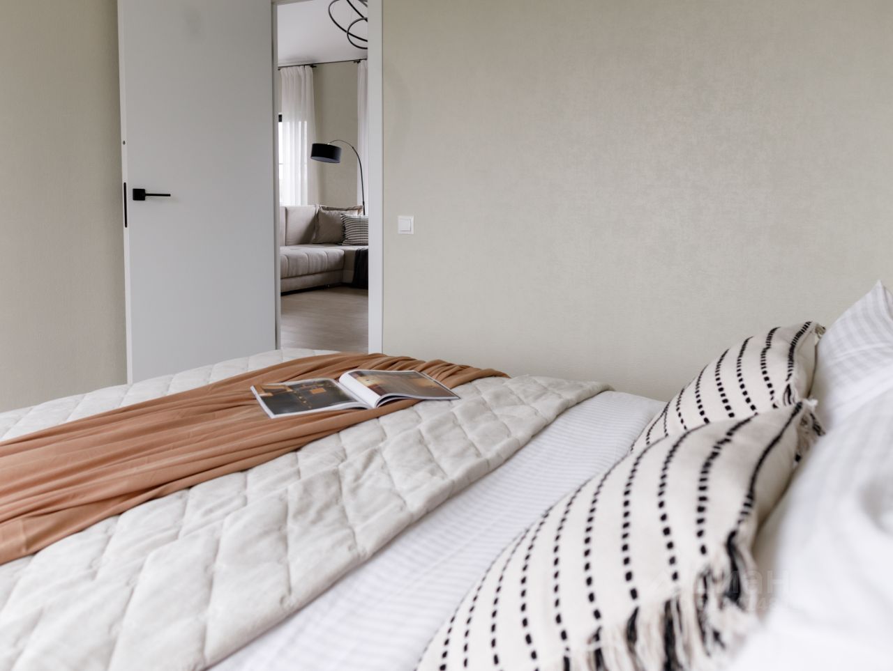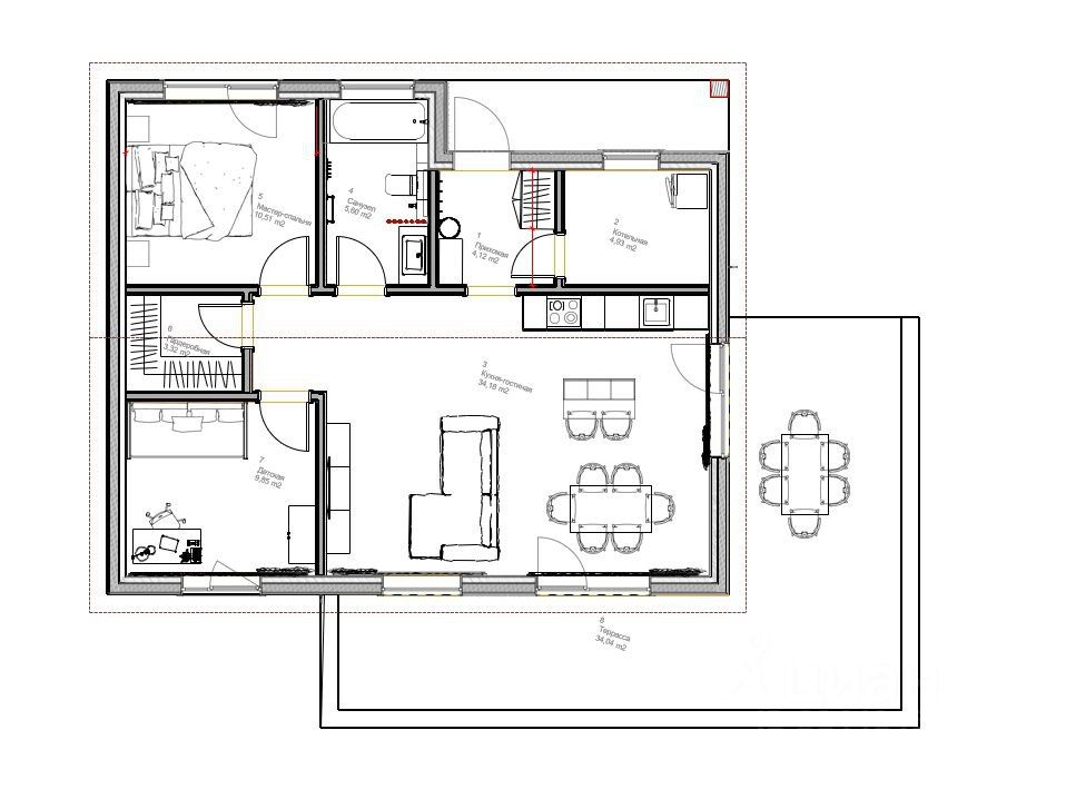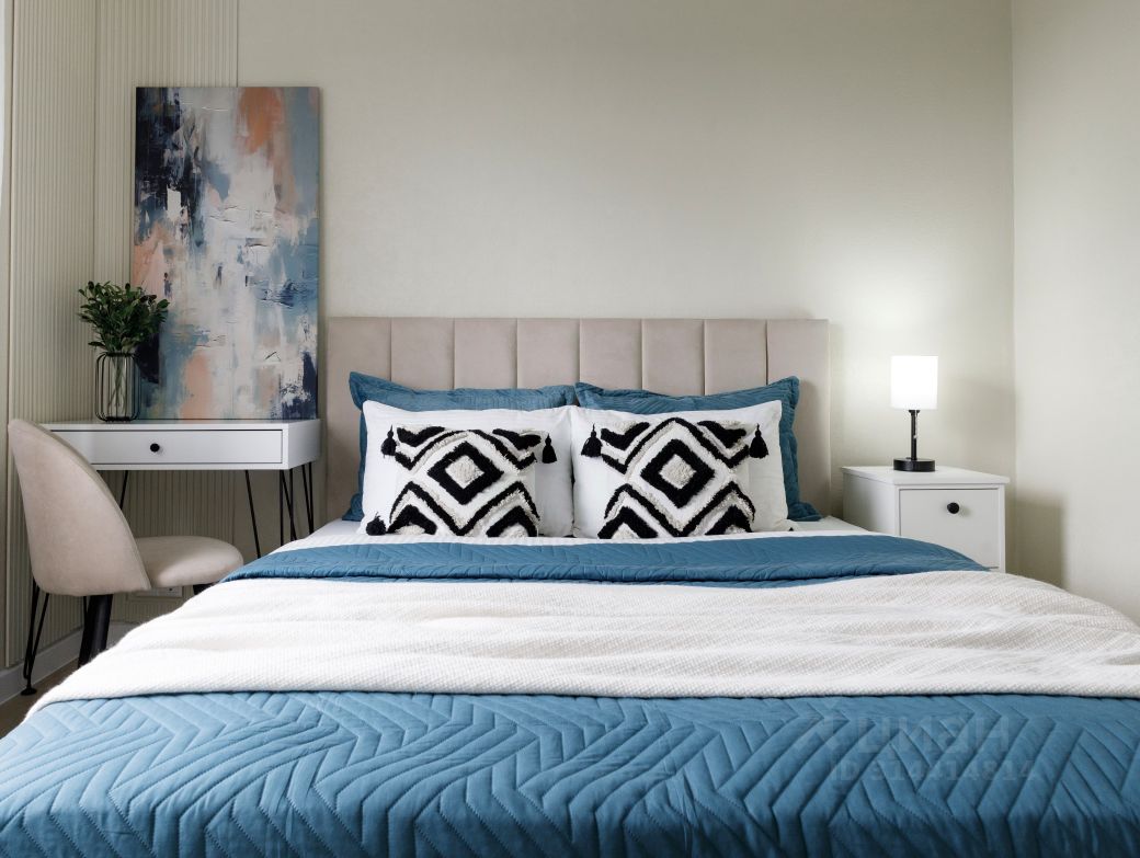 Удобная планировка включает большую гостиную-кухню, две светлых спальных комнаты, функциональную ванную зону, вместительную гардеробную и открытую террасу, где приятно коротать теплые летние вечера на свежем воздухе.