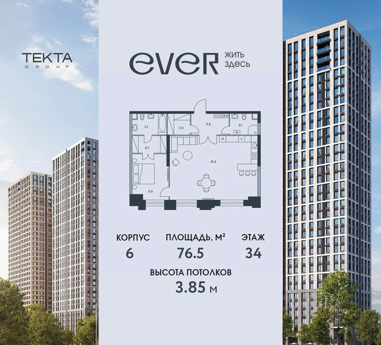 2-комн. квартира в ЖК ''Ever'' на 34 этаже в 34 этажном здании Корпус 6. Общая площадь: 76.3 кв.м., жилая: 47.2 кв.м. Высота потолков 3.85 м.