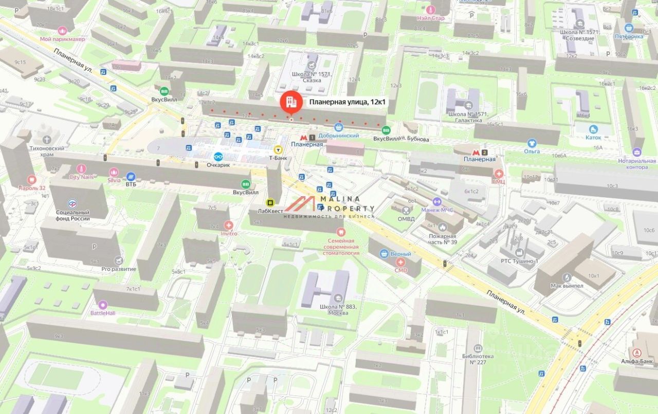 Помещения расположены в крупном сложившемся жилом районе с высокой плотностью застройки и развитой инфраструктурой. Рядом находятся транспортно-пересадочный узел и торговый центр ''Планерная''. Интенсивный пешеходный и автомобильный трафик. Окружение: магазин продуктов ''ВкуВилл'', аптека ''Столички'', банк ''Сбербанк'', магазин табака ''МосТабак'', магазин продуктов ''Добрынинский'', аптека ''Живика'', лофт-бар, СоюзЦветТорг.