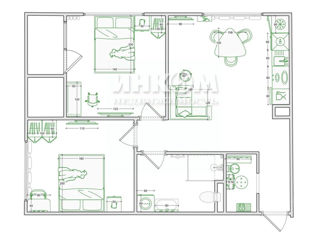 - Спальни: две уютные комнаты, идеально подходящие для отдыха и сна. - Кухня-гостиная: просторная зона для семейных ужинов и приема гостей. - Гардеробная: отдельное помещение для хранения одежды и аксессуаров. - С/У: огромная ванная комната площадью почти 6 кв.