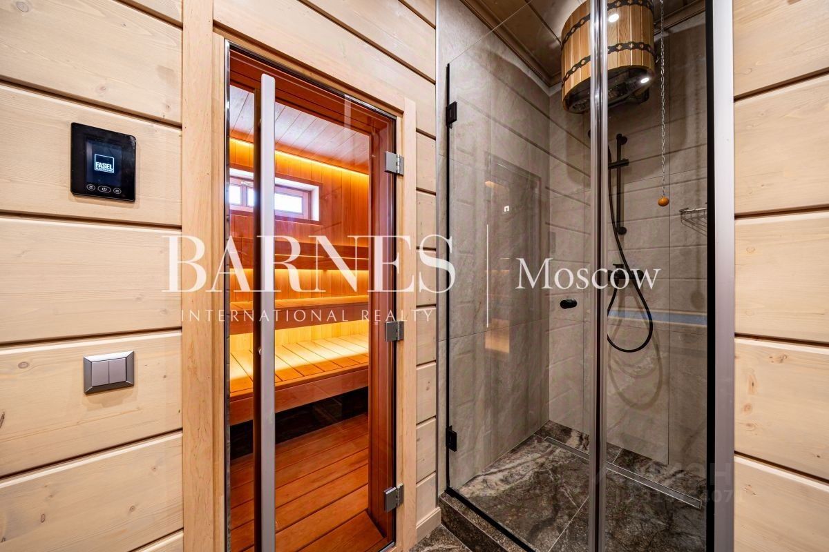 Планировка и функциональные зоны: Первый этаж: Входной холл Просторная гостиная-столовая с кухней, объединённой с зоной второго света (высота потолков — 6 метров), с выходом на террасу с уличным камином и садом Кабинет или гостевая комната Русская баня с санузлом, душевой зоной, купелью и комнатой отдыха Постирочная с отдельным входом со стороны улицы Котельная с отдельным входом Кладовая для хранения инструментов, велосипедов и колясок, также снаружи предусмотрен отдельный вход Второй этаж: Холл с балконом Основная спальня с собственным санузлом, ванной и душевой кабиной Детская спальня с санузлом и душем Цокольный этаж: Подполье, где предусмотрены места для хранения садового инвентаря и оборудования Участок и наружная инфраструктура: Кровля навеса для двух машин выполнена по каркасной технологии из клееного бруса и покрыта фальцевой кровлей. Дом ориентирован террасой на границу участка с полем и лесом, есть возможность отдельного выхода к речке и в лесные массивы.