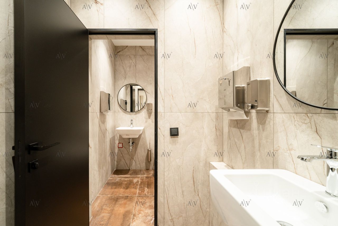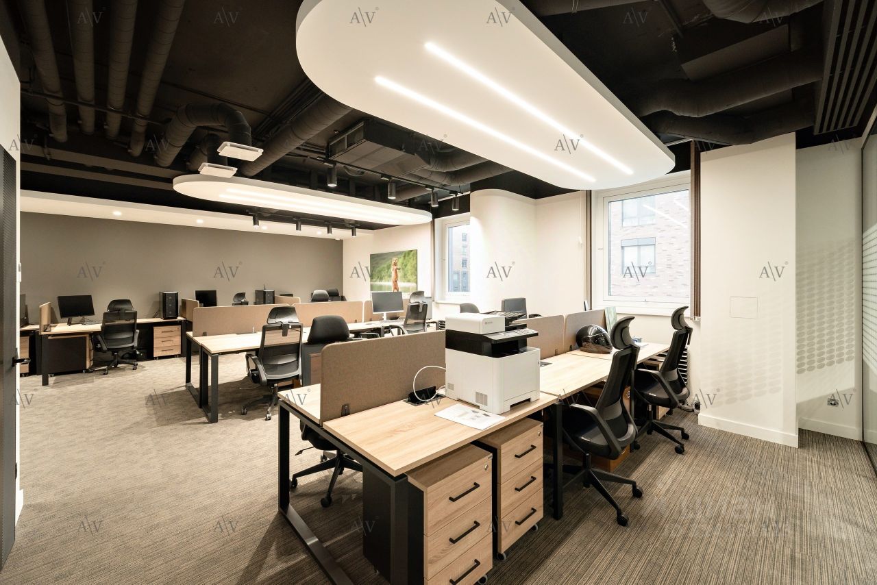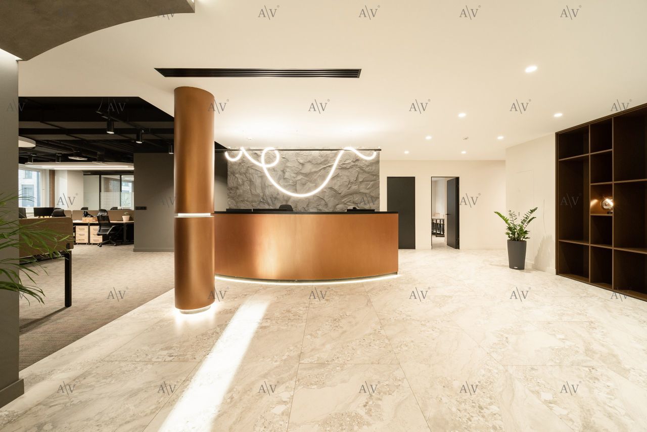 ОФИСНАЯ ЧАСТЬ ВКЛЮЧАЕТ: 2 open space зоны — удобное пространство для организации работы команды Кабинет руководителя — 70 м² Кабинет заместителя Переговорная Полностью оборудованная кухня Зона ресепшн для приема гостей и посетителей