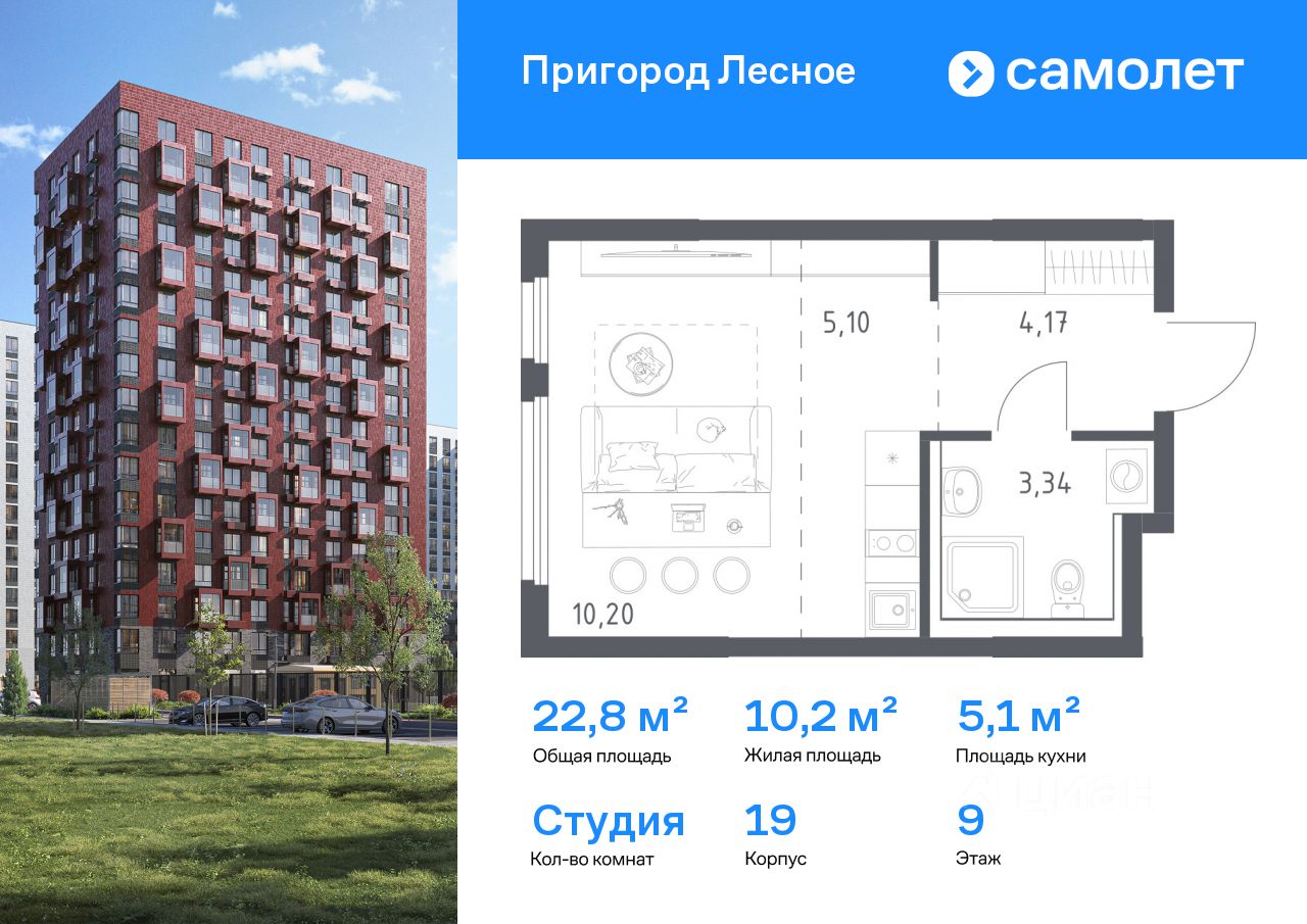 Строим кварталы для жизни с заботой о будущем. Предлагается квартира студия комфорт-класса 22,81 кв.м в корпусе 19 на 9 этаже, в ЖК ''Пригород Лесное'' Квартира с чистовой отделкой. Доступность дополнительных опций уточняйте у застройщика.