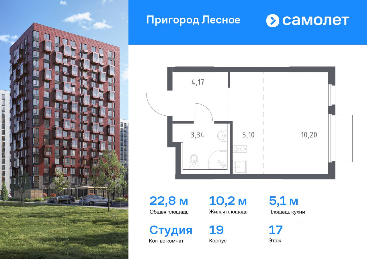 Предлагается квартира студия комфорт-класса 22,81 кв.м в корпусе 19 на 17 этаже, в ЖК ''Пригород Лесное'' Квартира с предчистовой отделкой. Доступность дополнительных опций уточняйте у застройщика.