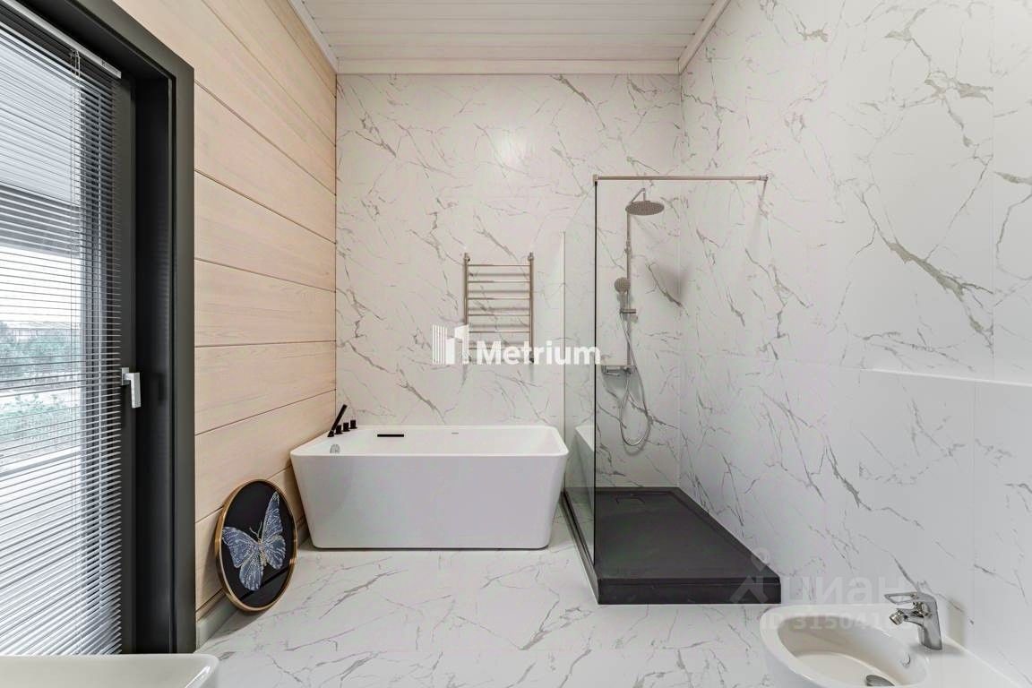 На втором этаже также предусмотрены два балкона-террасы, с которых открывается панорамный вид на участок с высаженными хвойными деревьями и ландшафтным дизайном. Установлена современная техника и дизайнерская мебель. На территории есть навес на 2 автомобиля.