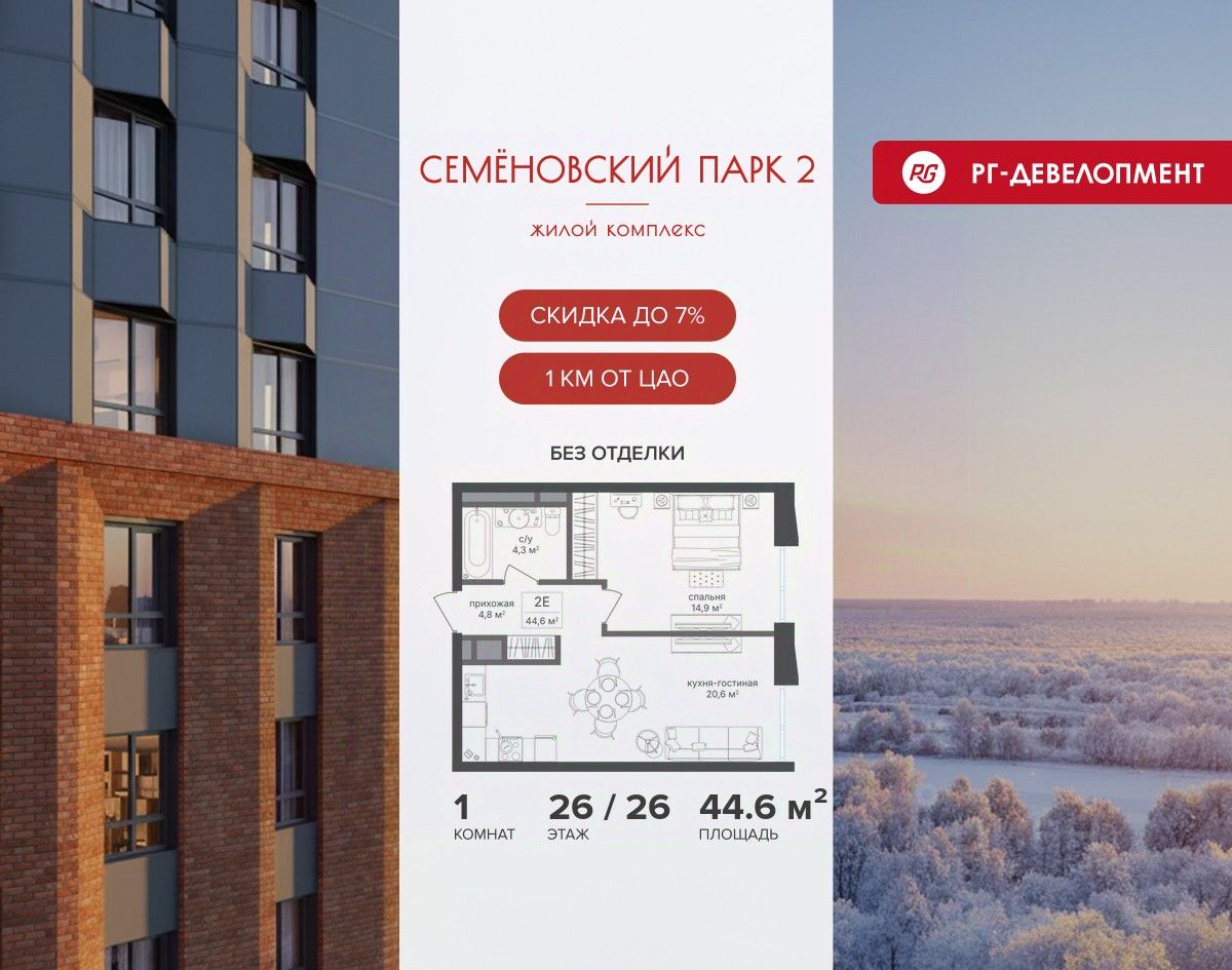 Продается 1-к квартира 44,6 кв.м. в ЖК ''Семеновский парк 2'' на 26-м этаже 26 этажного дома.