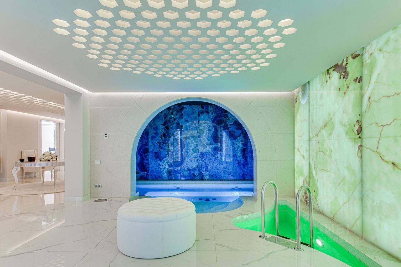 ПОЭТАЖНОЕ ОПИСАНИЕ: Цоколь: котельная, постирочная, гладильная, SPA-зона с небольшим бассейном с купелью, хамам, сауна, душевые, массажная комната, санузел, комната-салон (парикмахерская, маникюр), зал для отдыха. 1-ый уровень: холл, гардеробная, санузел, кабинет, кухня рабочая, кухня-столовая, гостиная с каминным залом. 2-ой уровень: холл, 3 спальни с индивидуальными ванными и гардеробными комнатами. Мансарда: игровая, холл, 2 спальни с ванными и гардеробными комнатами, кинотеатр.