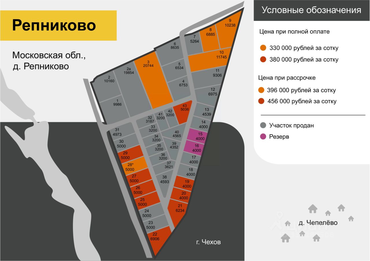 Земельный участок 2.07 Га расположен в 50 километрах от МКАД в Чеховском районе Московской области рядом с деревней Репниково. Удобное расположение между автомобильными дорогами федерального назначения Большим и Малым Московским Кольцом (А-108 и А-107). От ЦКАД 20 км. Отличный круглогодичный подъезд по новой асфальтированной дороги без светофоров и ж\д переездов прямо до участка. Прямой официальный съезд с шоссе.