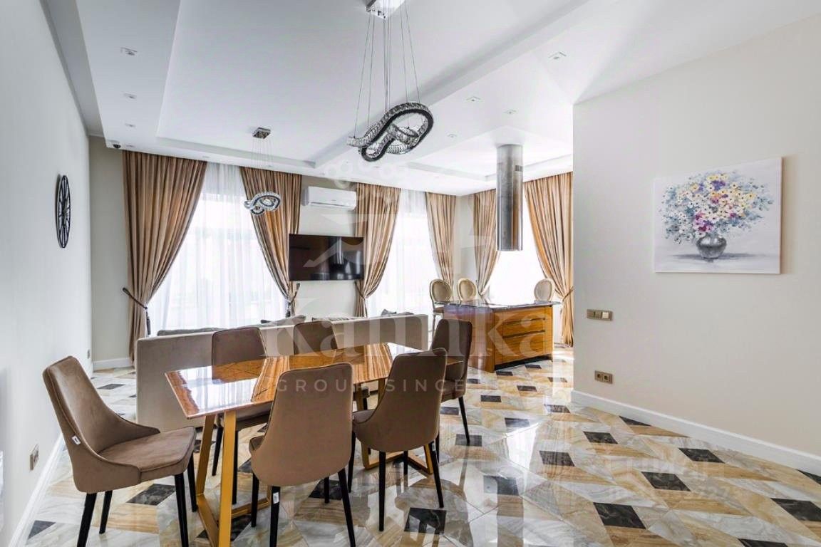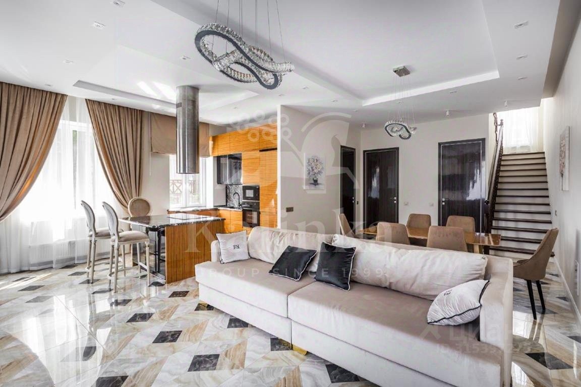 Меблированный дуплекс площадью 250 кв.м расположен на участке 3,2 сотки в коттеджном поселке ''Европа''. Фасад облицован бежевой клинкерной плиткой, украшен белыми наличниками. Современный интерьер выполнен в теплой светлой гамме цветов. Внутри разместили 3 спальни, кухню-столовую, гостиную, кабинет и кинотеатр. Дуплекс оснащен системой видеонаблюдения, полностью меблирован и оборудован современной бытовой техникой. На огороженном участке засеян газон и установлено уличное освещение.