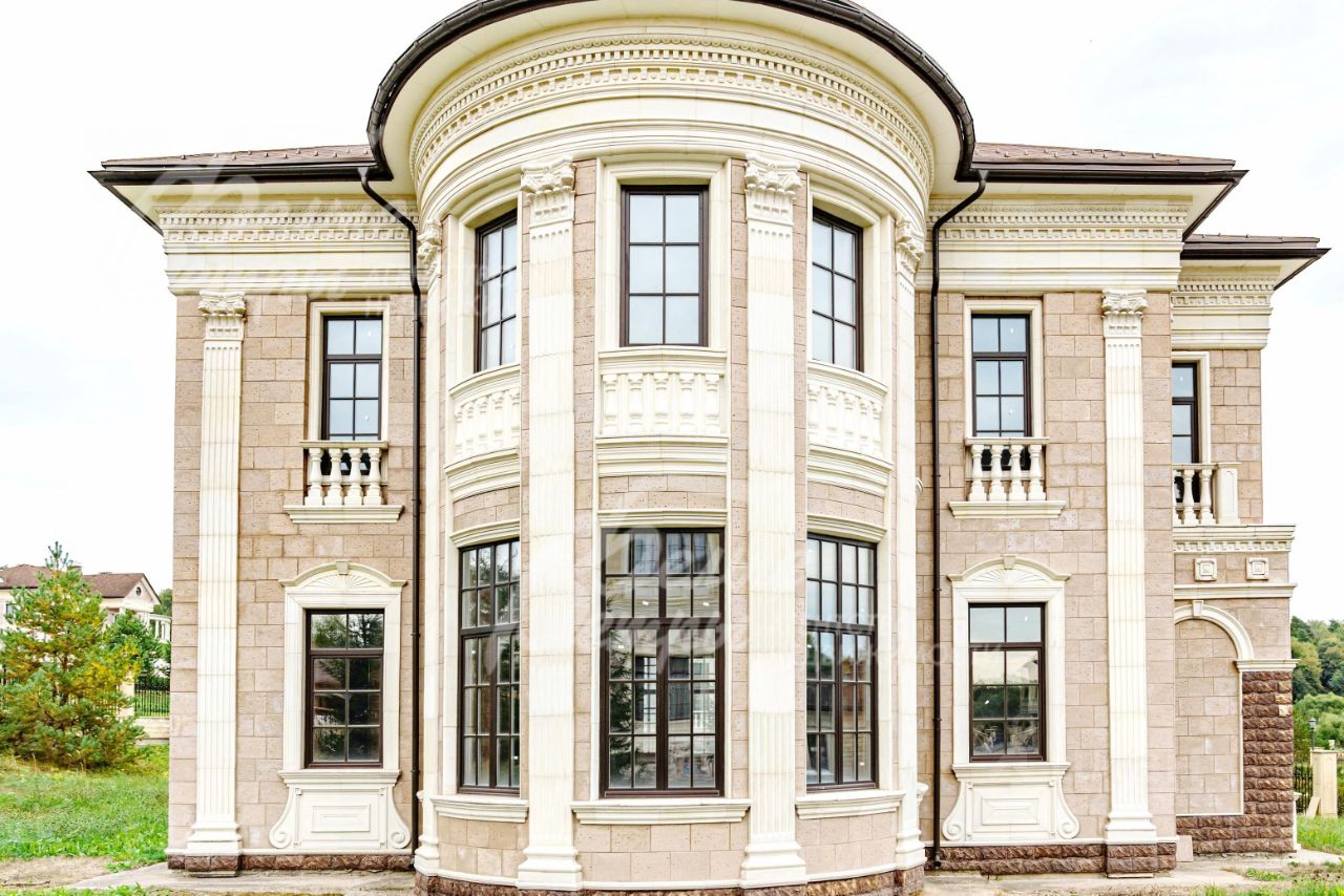 Материал стен: кирпич. Облицовка стен: искусственный камень + много декора в облицовке дома (колонны, пилястры, балюстрады, капители, картины).