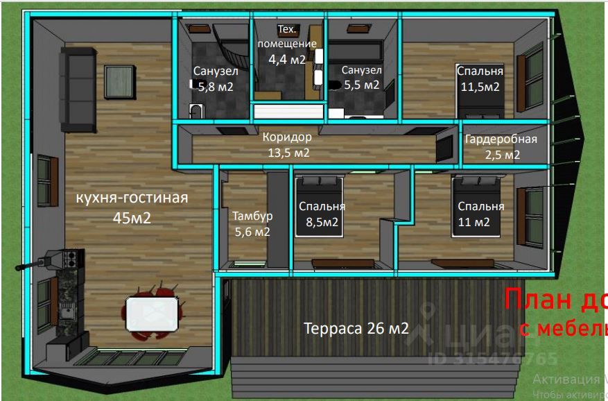 Современный Каркасный дом в финском стиле площадью 143 кв.м включая летнюю террасу 26 кв.м (общая площадь всех комнат- 117 кв.м) расположен на участке 12 соток ИЖС Описание дома: 3 спальни, кухня-столовая-гостиная, 2 санузла, техническое помещение, холл и гардеробная. Высота потолка в гостиной: 4.2 м создаёт атмосферу простора и света. плюсом Чердачное помещение! 90кв.м. Участок: прямоугольной формы, высокий и сухой, песчаная почва, не огорожен, очень большая прилегающая территория перед участком Строительные материалы: Каркас из качественной сосны размером 150*50, лаги и стропила размером 200*50.