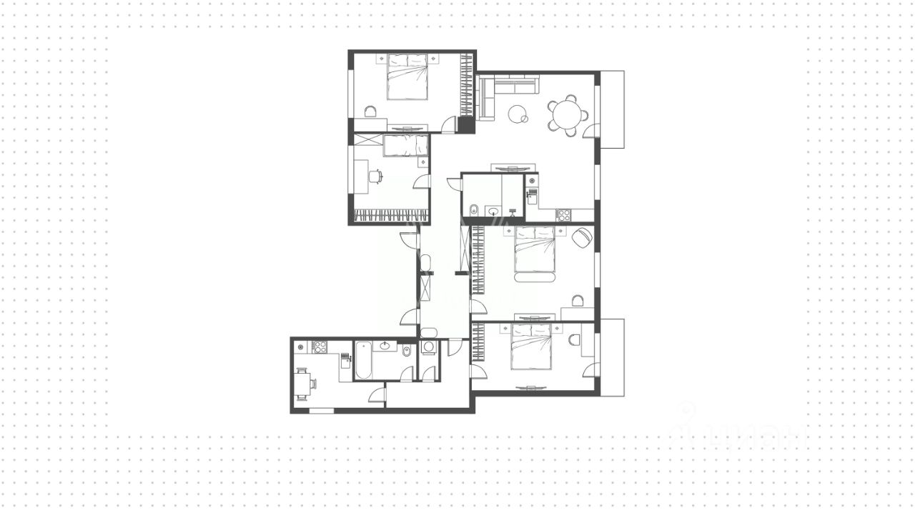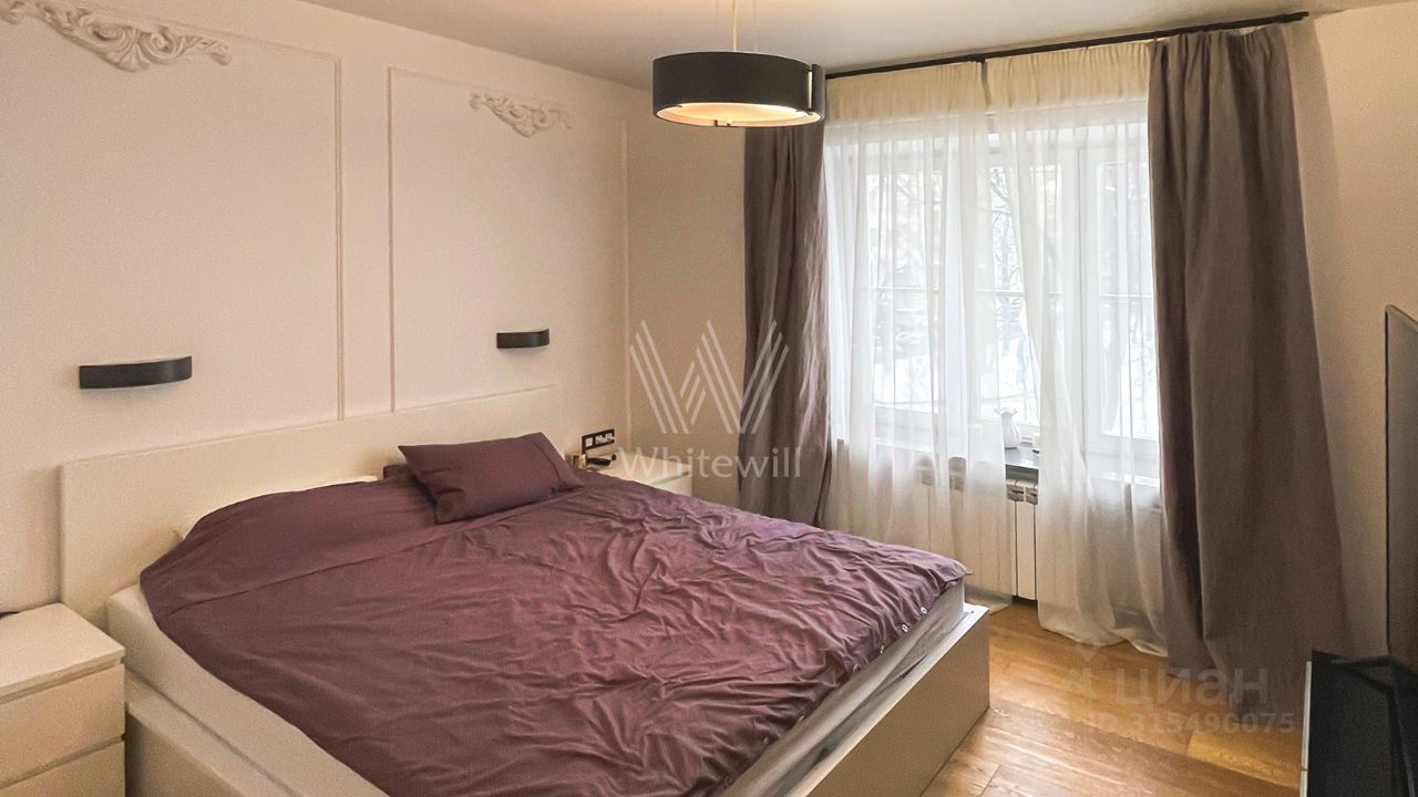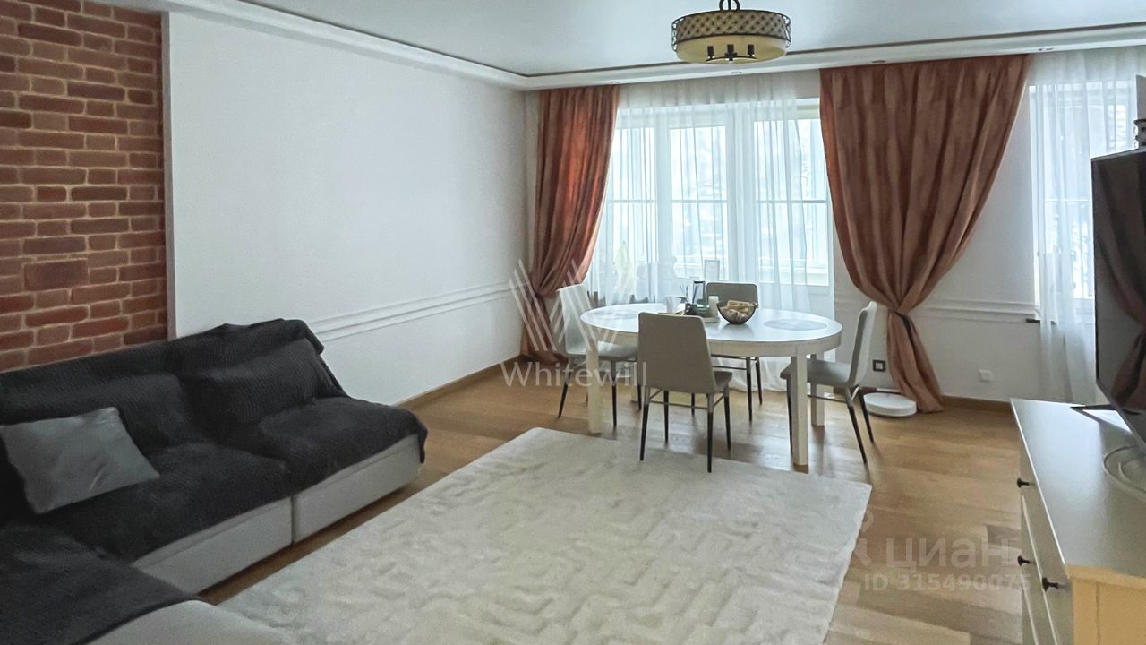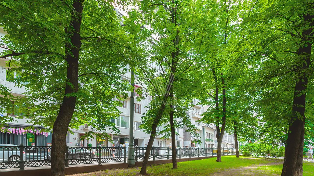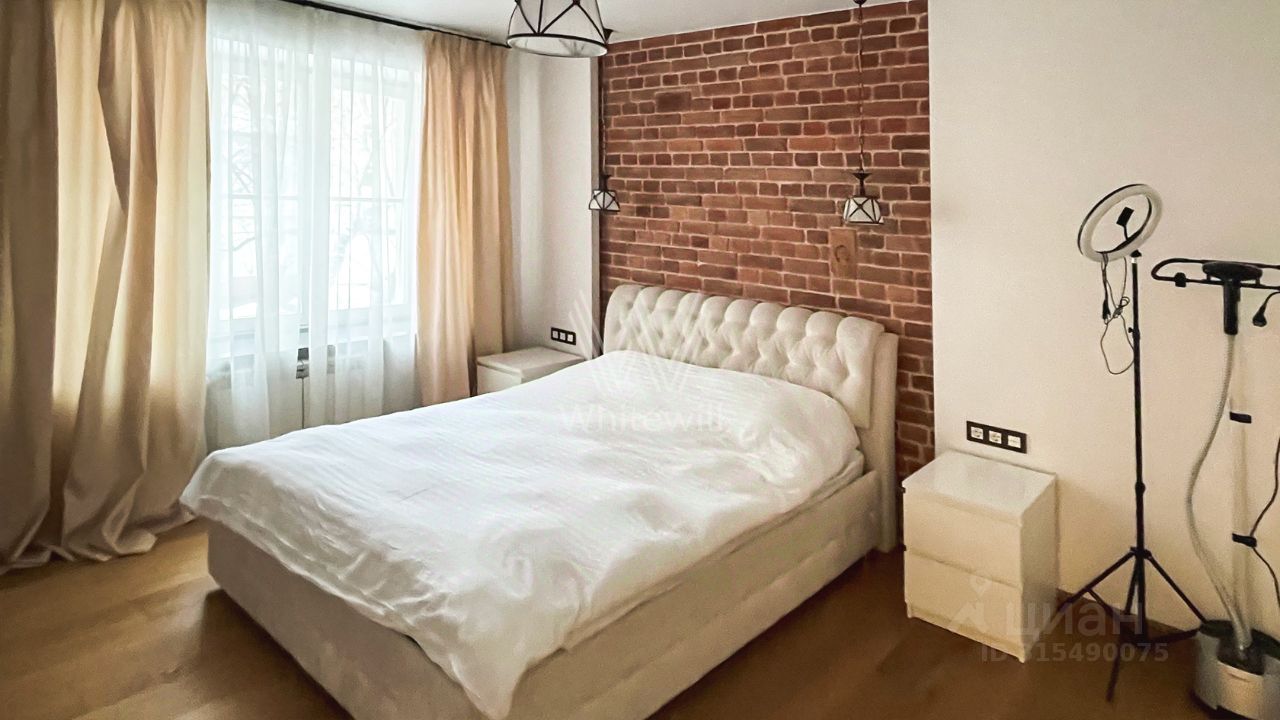 Просторная квартира с четырьмя спальнями общей площадью 145 м² в доме напротив Патриаршего пруда. Квартира с отделкой расположена на втором этаже. Интерьер — в современном стиле в светлых тонах, часть стен оформлена открытой кирпичной кладкой. Спланирована гостиная с выходом на балкон, кухня, четыре спальни, одна из которых с балконом, две ванные комнаты, гостевой санузел, холл. Квартира полностью меблирована и оборудована бытовой техникой. Окна ориентированы на три стороны, открываются виды на пруд и в тихий уютный двор.