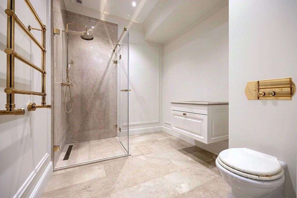 Второй уровень отведён под спальни с санузлами и гардеробными. Двери из помещений выходят в холл с панорамными окнами. Отделка стен и потолков выдержана в светлых тонах. Полы покрыты плиткой из натурального камня и дерева.