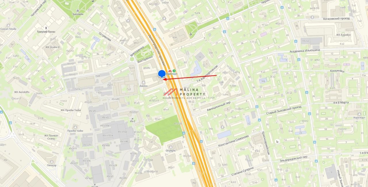 Помещение располагается на первой линии, 130 метров от метро Аэропорт, напротив остановка общественного транспорта. В радиусе 500 метров проживает около 8 000 человек. Интенсивный автомобильный и пешеходный трафик вдоль помещения. Окружение: БЦ ''Авион''.
