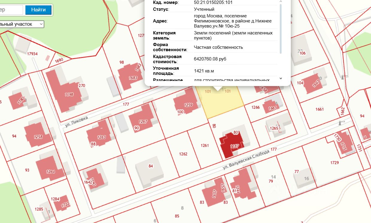 Земельный участок находится в Коттеджном поселке бизнес-класса Валуевская Слобода по адресу: город Москва, поселение Филимонковское, в районе деревни Нижнее Валуево. В поселке 65 домовладений. Расстояние от МКАД 9,0 км, ближайшее метро Филатов Луг Сокольнической линии метро в 4 км от коттеджного поселка. Земельный участок правильной прямоугольной формы площадью 14,21 соток. Участок сухой, огорожен со всех сторон. К границе участка подведены центральные коммуникации: газоснабжение АО Мосгаз, водоснабжение, электричество 15 кВт (3 фазы) Мосэнергосбыт, бытовая канализация АО Мосводоканал, ливневая канализация. На всех соседних участках построены дома, соседи проживают постоянно.