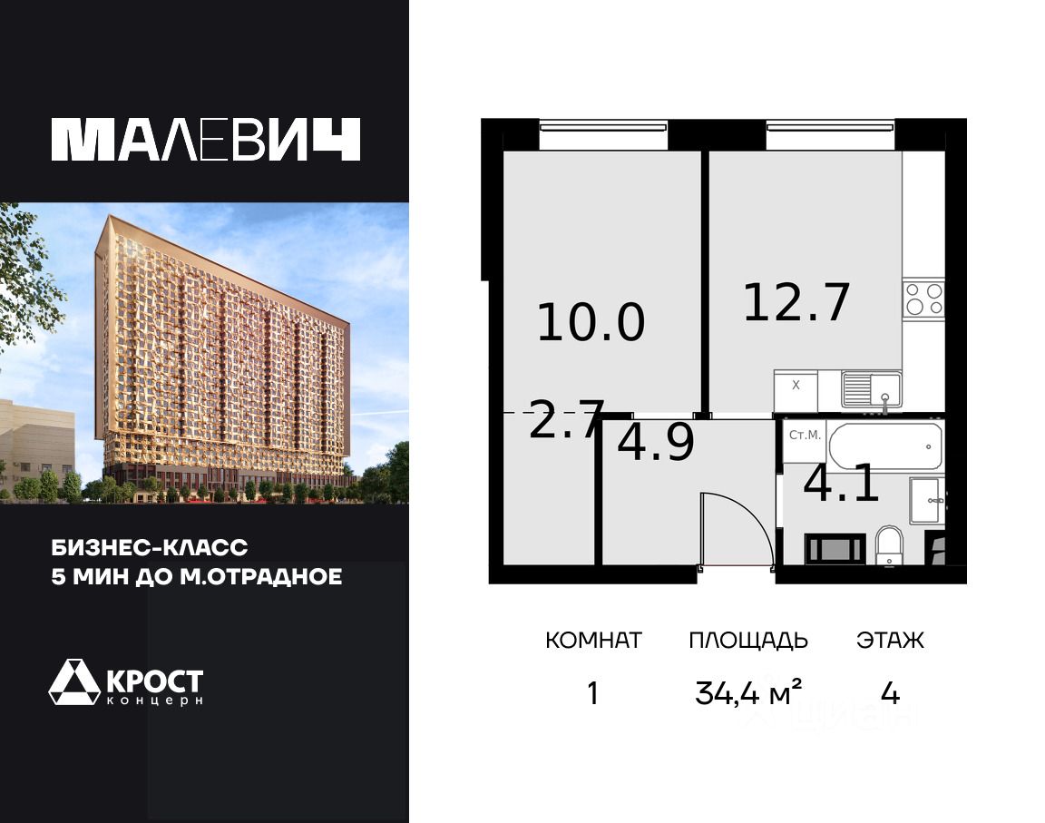 Продаётся 1-к апартаменты 34.4 кв.м. на 4-м этаже 28 этажного дома. Без отделки. Срок сдачи: 1 кв. 2026 г.