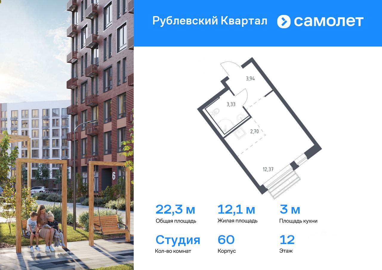 Предлагается квартира студия комфорт-класса 22,34 кв.м в корпусе 60 на 12 этаже, в ЖК ''Рублевский Квартал'' Квартира с чистовой отделкой. Доступность дополнительных опций уточняйте у застройщика.
