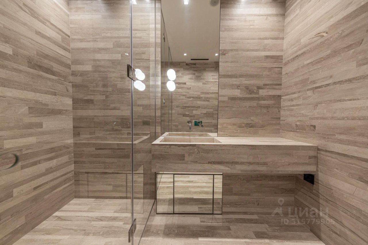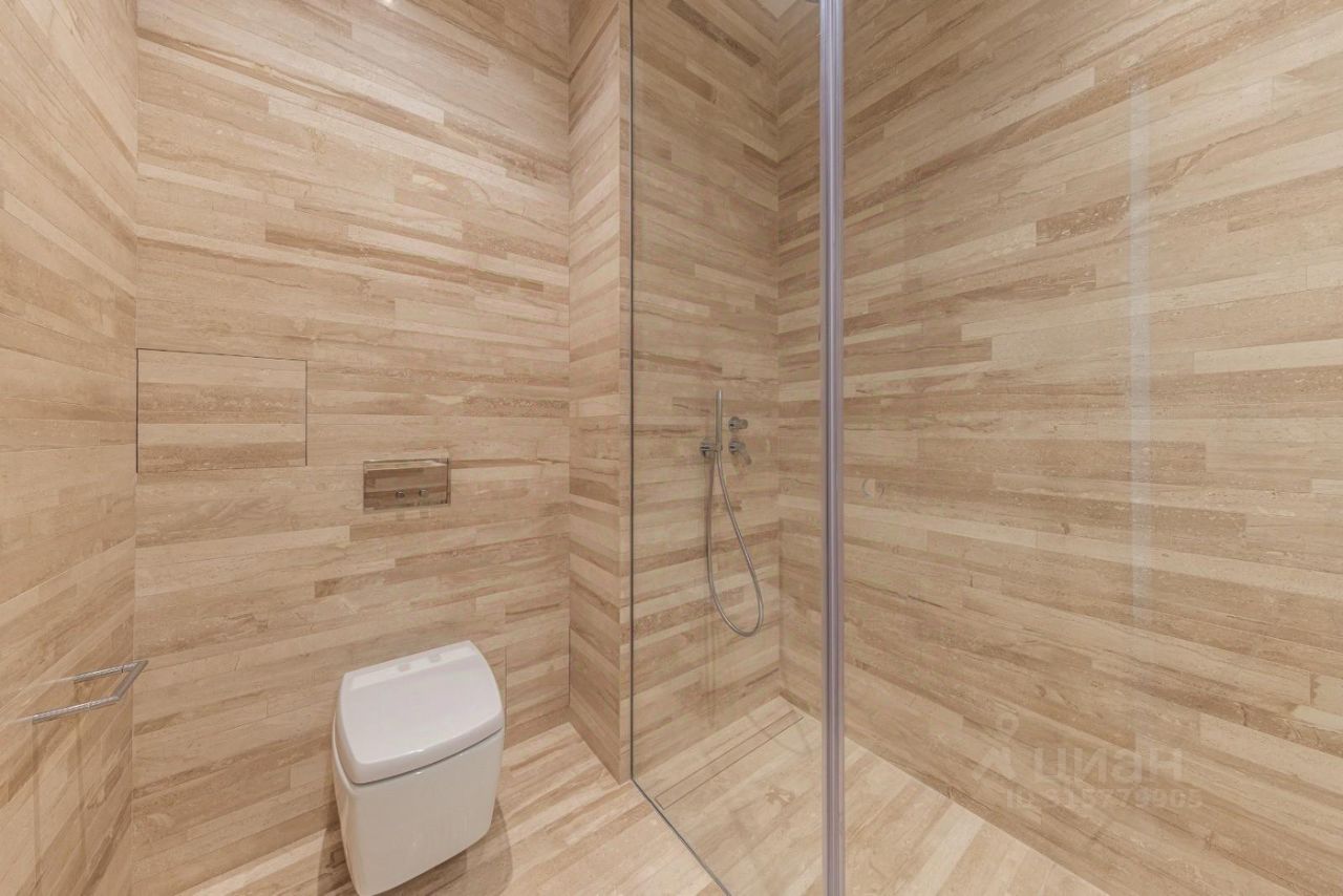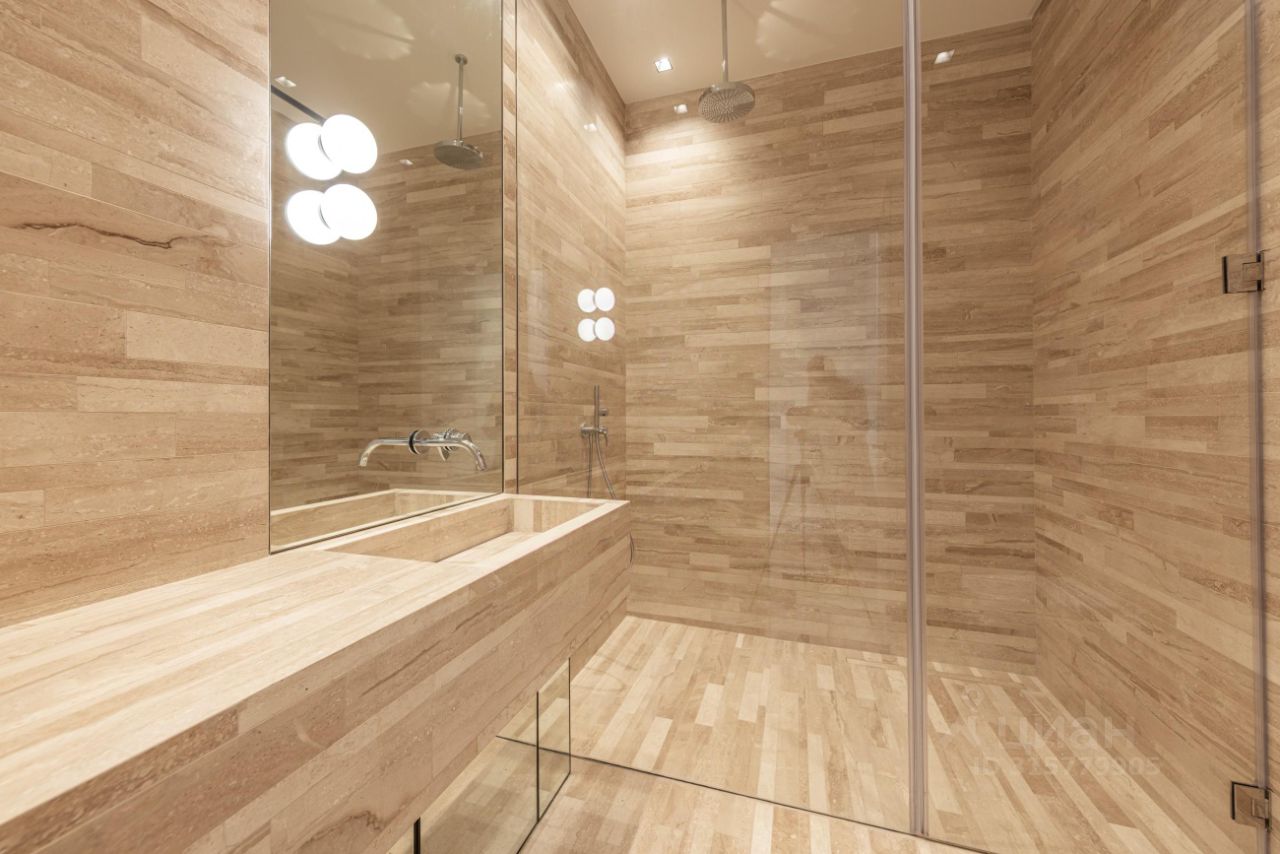 Панорамные окна в тихий двор. Душевая и с/у в светлом мраморе. Дизайн от известного французского архитектора Пьеро Лисони.