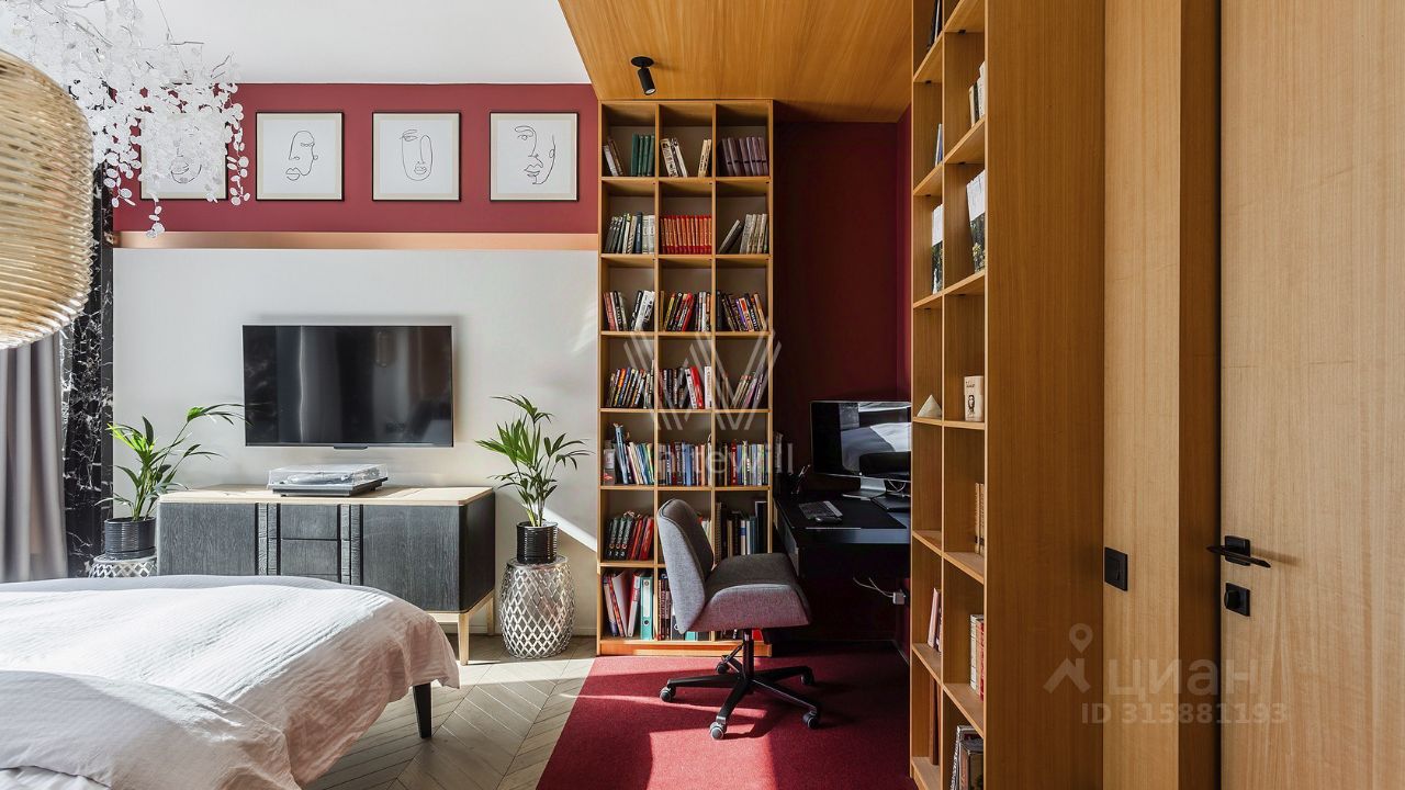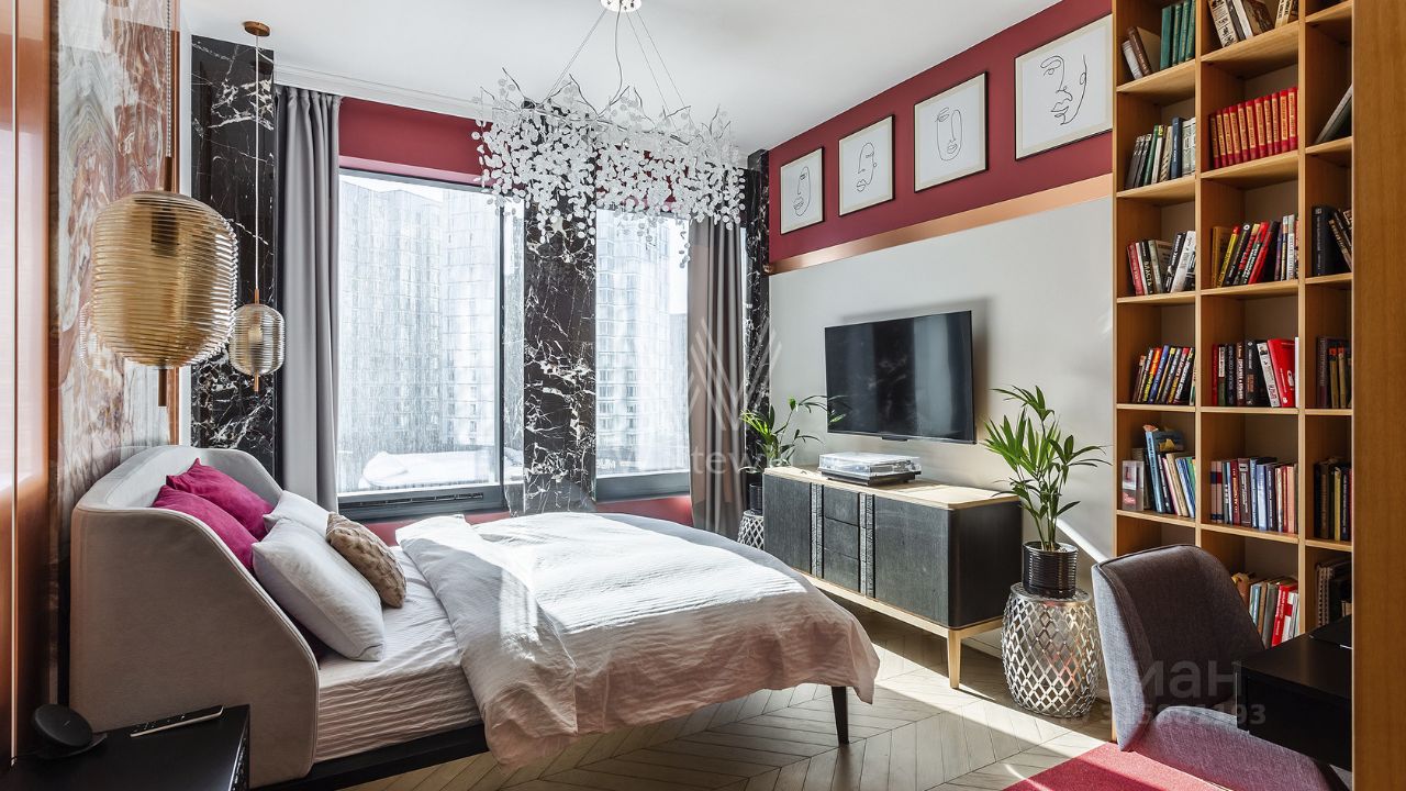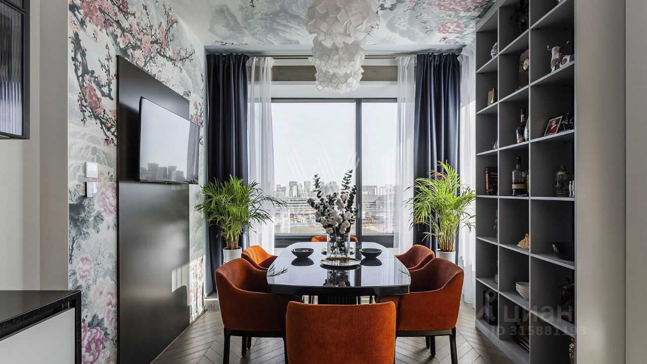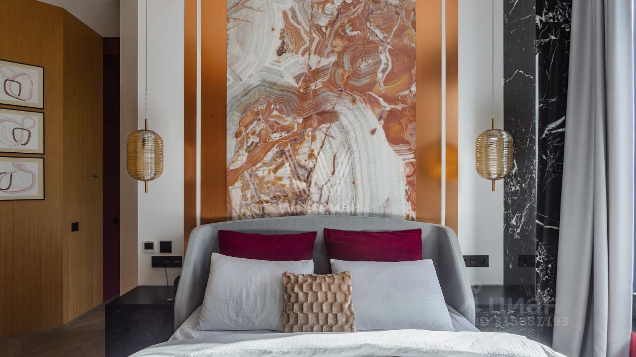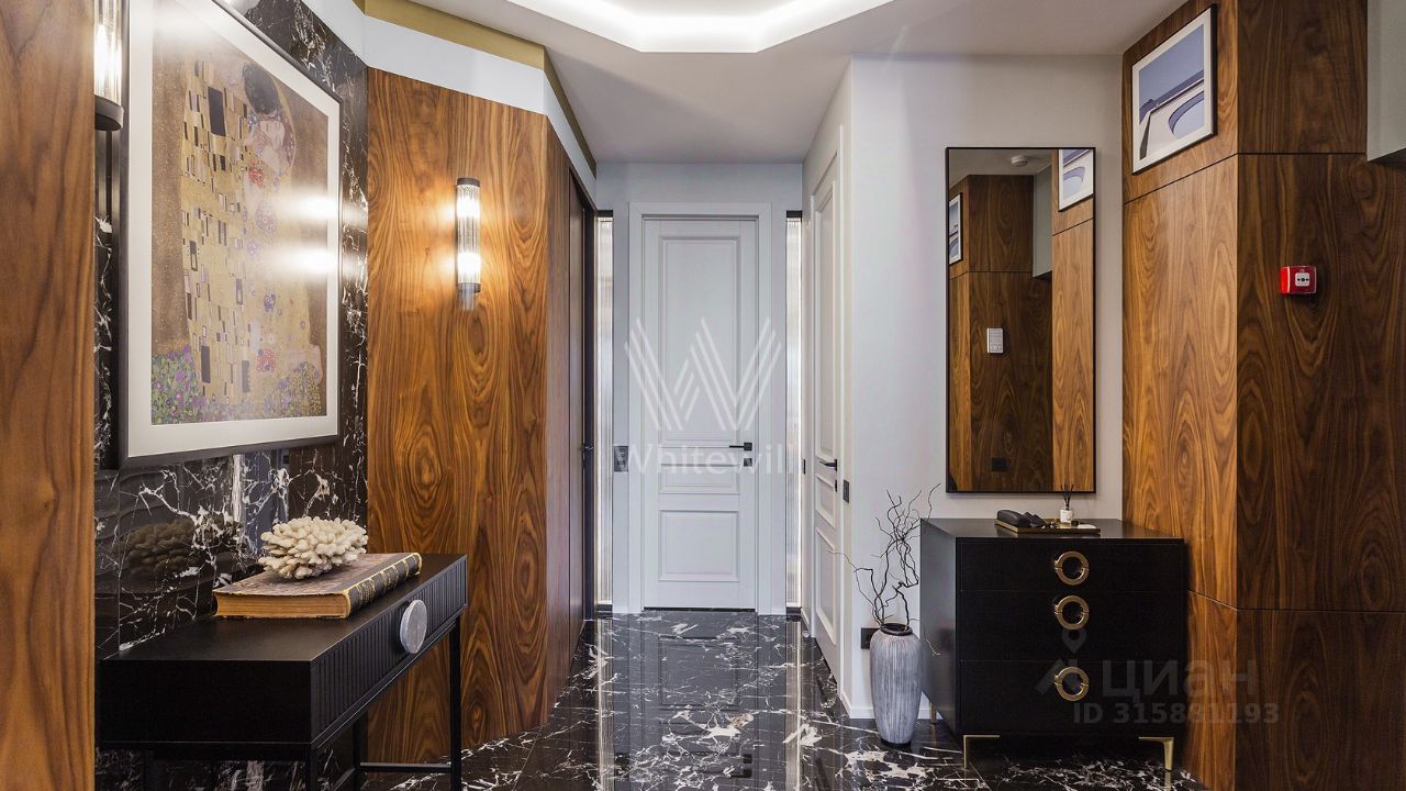 Интерьер квартиры вызывает восторг. • отделка стен шпоном ценных пород дерева с сочетанием оникса, меди и латуни • на полу паркетная доска • вся мебель гармонично сочетается между собой, бытовая техника Bosch • высота потолков 3,1 м • установлены система канального кондиционирования ''чиллер-фанкойл'', приточной вентиляцией • внутрипольные конвекторы и ''теплый пол'' придают комфорт в зимнее время