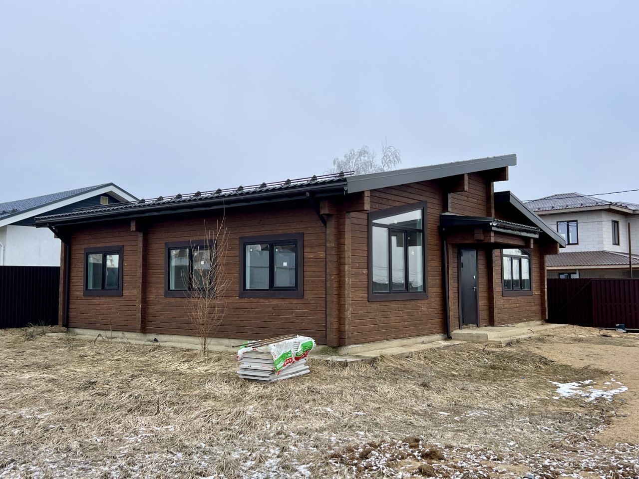 Коттедж 111,3м2 с отделкой из бруса 220мм, в КП 5 соток, на участке 5,7 соток, огорожен: калитка и автоматические ворота. Фундамент - монолитная плита 300мм + отмостка вокруг дома.