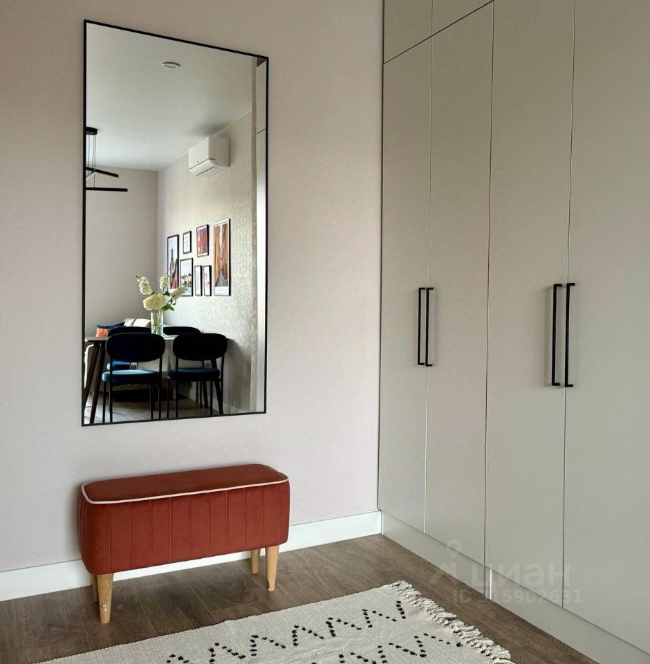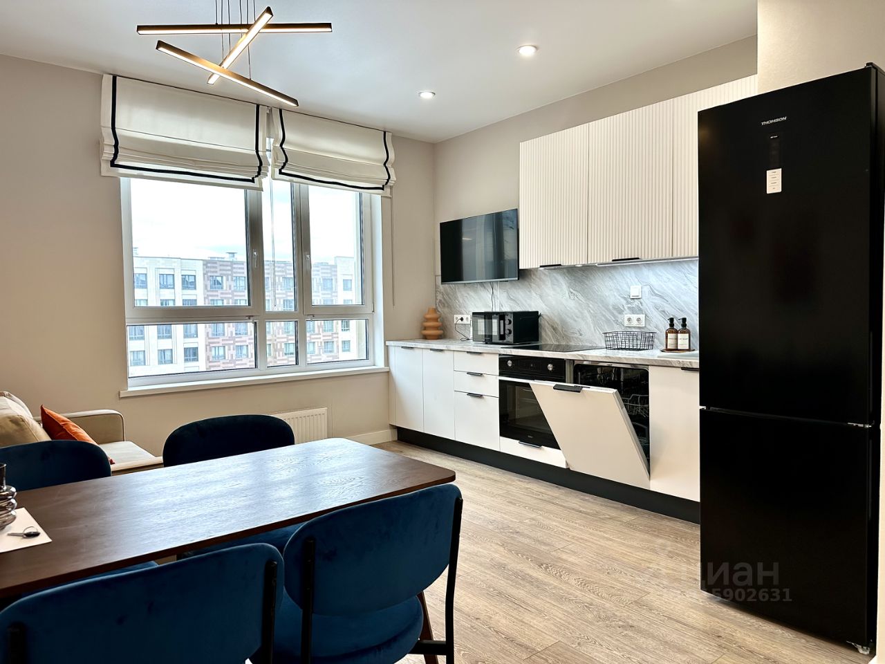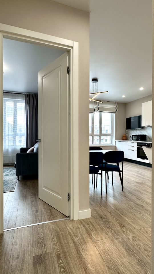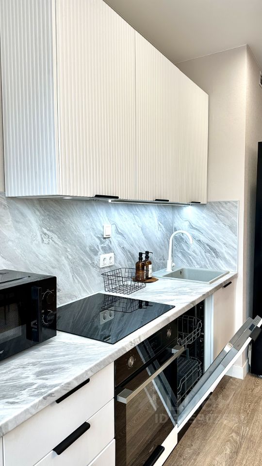 В квартире выполнен качественный евроремонт. Просторная кухня-гостиная площадью 17 кв. м оборудована всей необходимой мебелью и техникой: холодильник, посудомоечная машина, стиральная машина, установлен кондиционер и телевизор, в комнатах — удобная мебель. Два совмещенных санузла (с ванной и душевой кабиной). Вместительный гардероб.